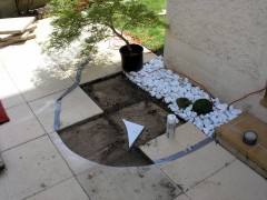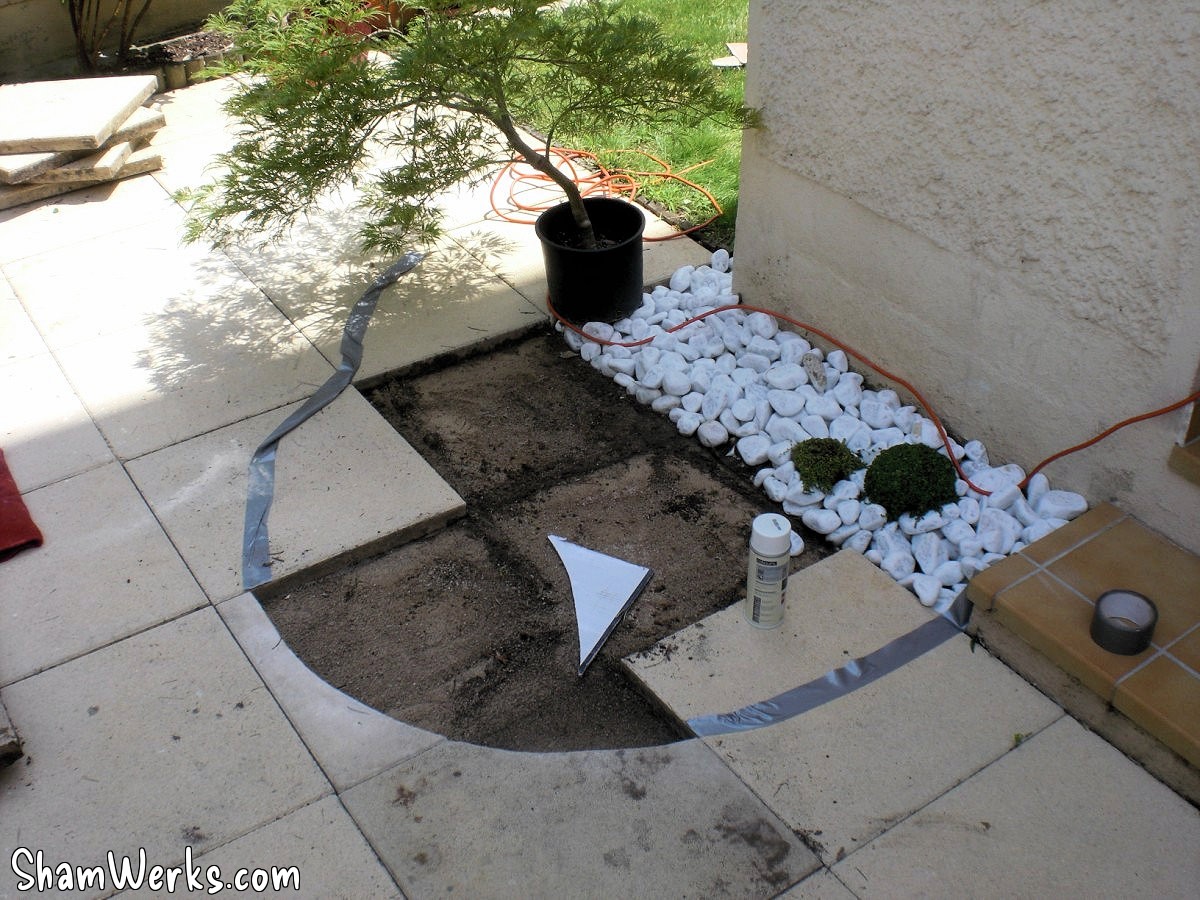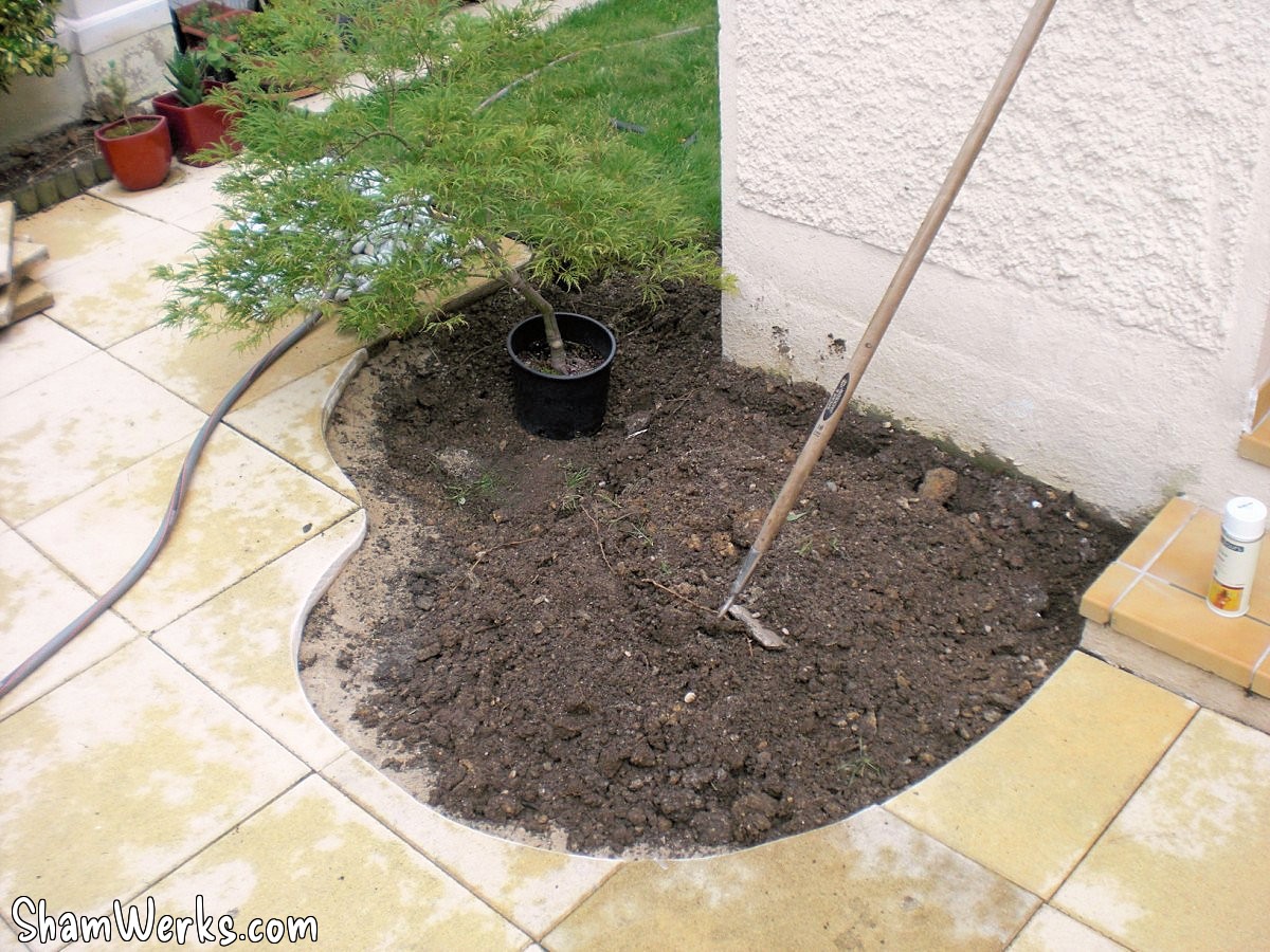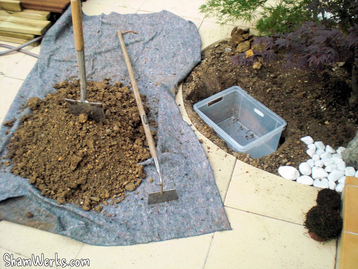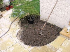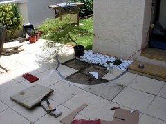 The taller one is anAcer Palmatum Matsumurae while the smaller one is an Acer Palmatum Dissectum (one can recognize it thanks to its dissected leaves). Mapple trees do not like the clay-ish soil of my garden, therefore I gave them a mix of peaty soil, leaf mould and sand, which they seem to appreciate. Next, putting in place the tank for the closed-circuit fountain. It's a tsukubai ; traditionally, the stone basin (chozubachi) is here to allow one to perform his ablutions right before arriving to the tea house. And since the basin is low, it makes everyone, whatever their social rank, putting a knee to the ground, though prompting to humility. Well, in my case, I only wanted to hear the water flowing noise! 😁