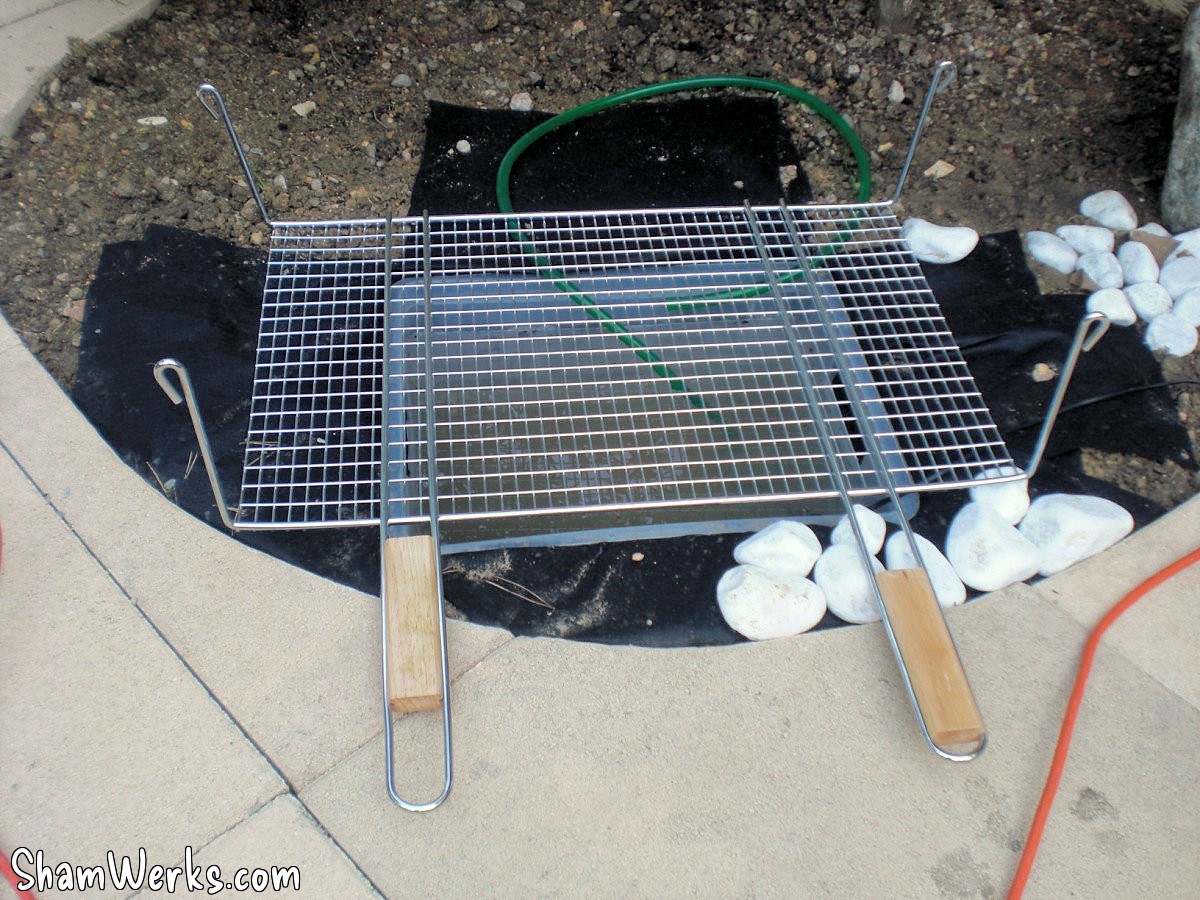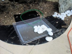 In the other hand, I did not want the shishi-odoshi made famous by the movie Kill Bill (remember, the fight between Lucy Liù and Uma Thurman in a Japanese garden : that was the bamboo fountain making a regular tocking noise) : too noisy, I only want a tiny whisper of water flow, not giving my neighbors a reason to call the cops... Traditionally, it was supposed to scare away the deers, but well, they are pretty seldom in my neighborhood these days. 😉 For the tank, I used a plastic storage box. Plus, its hadles holes are nice overflow security : in case of rain, the tank won't be overflowed, the water will get out through those holes. The tank is surrounded with stones, gravels and sand, to drain the water away. Beware of the spiky stones anyway, I've broken the bottom of two boxes before I actually could put it in place correctly!