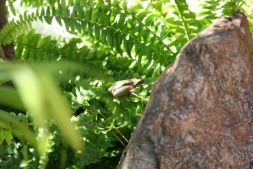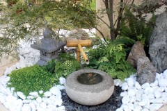 On the ground, some Helexine (creeping plant originating from Corsica, with very small leaves, looks like moss), some Adiantum Fragrans around the tsukubai, and a fern behind the three stones.