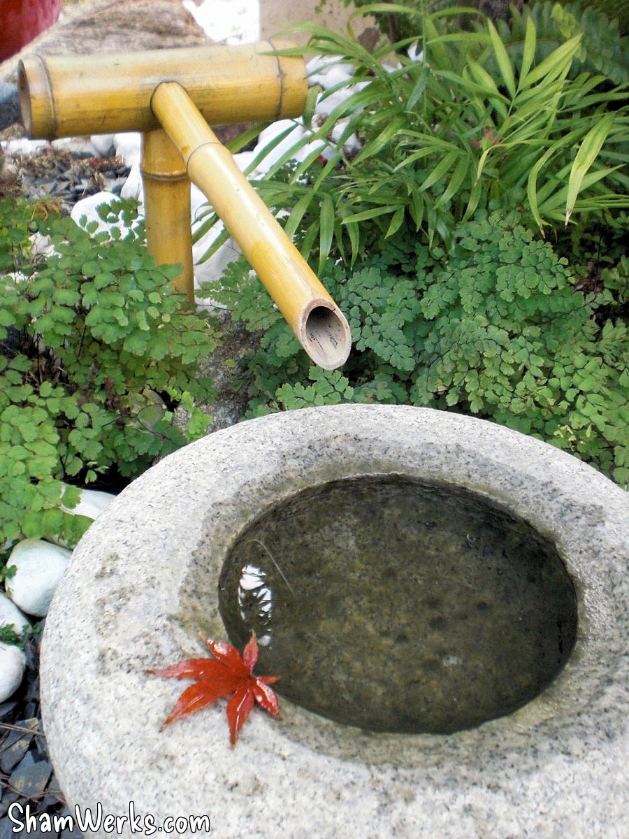 A small aquarium pump pushed the water into the bamboo spout, it flows into the sink, overflows into the tank below... Looping the loop.