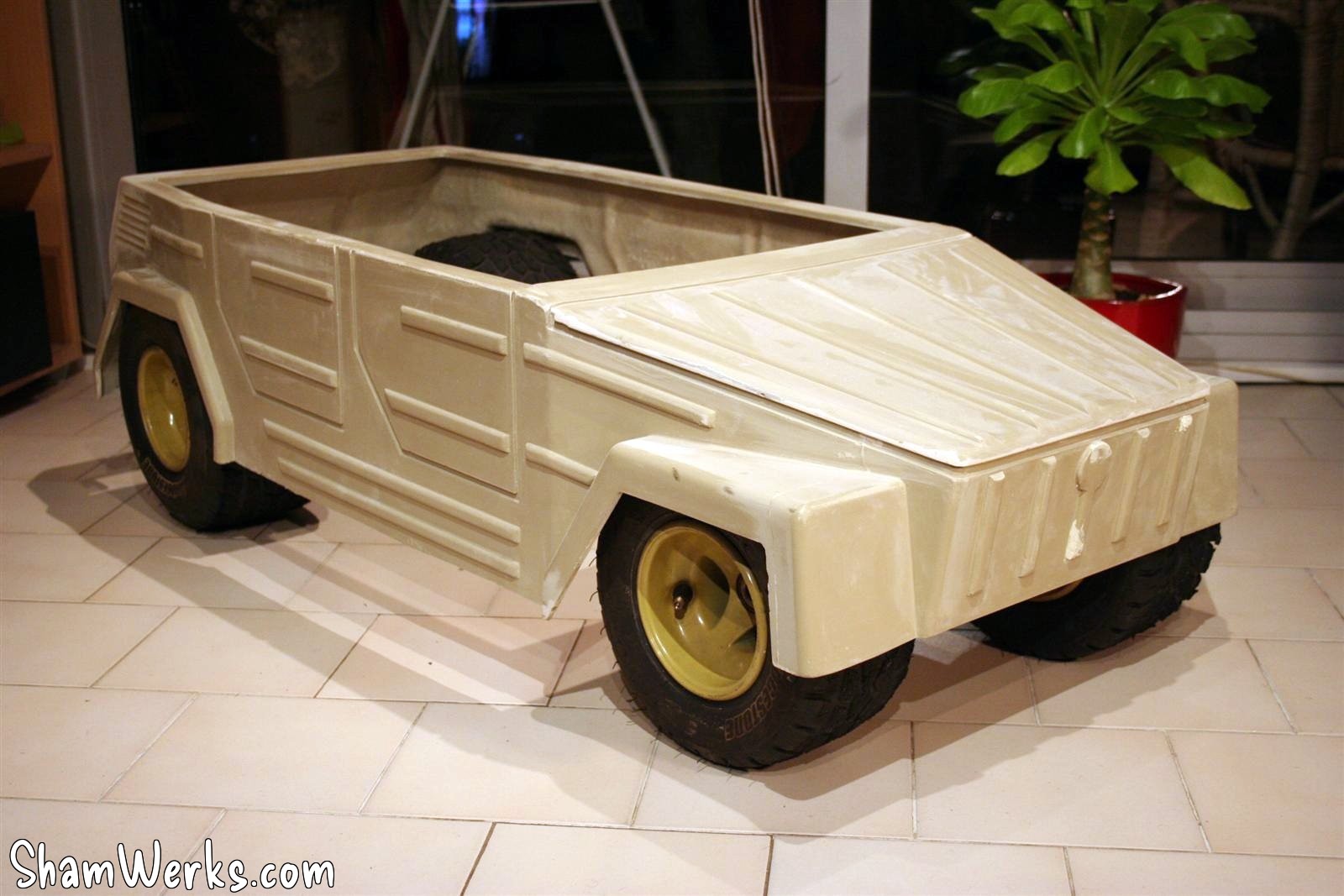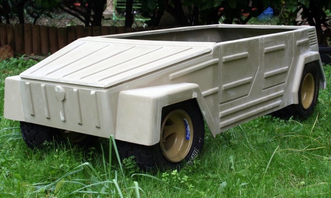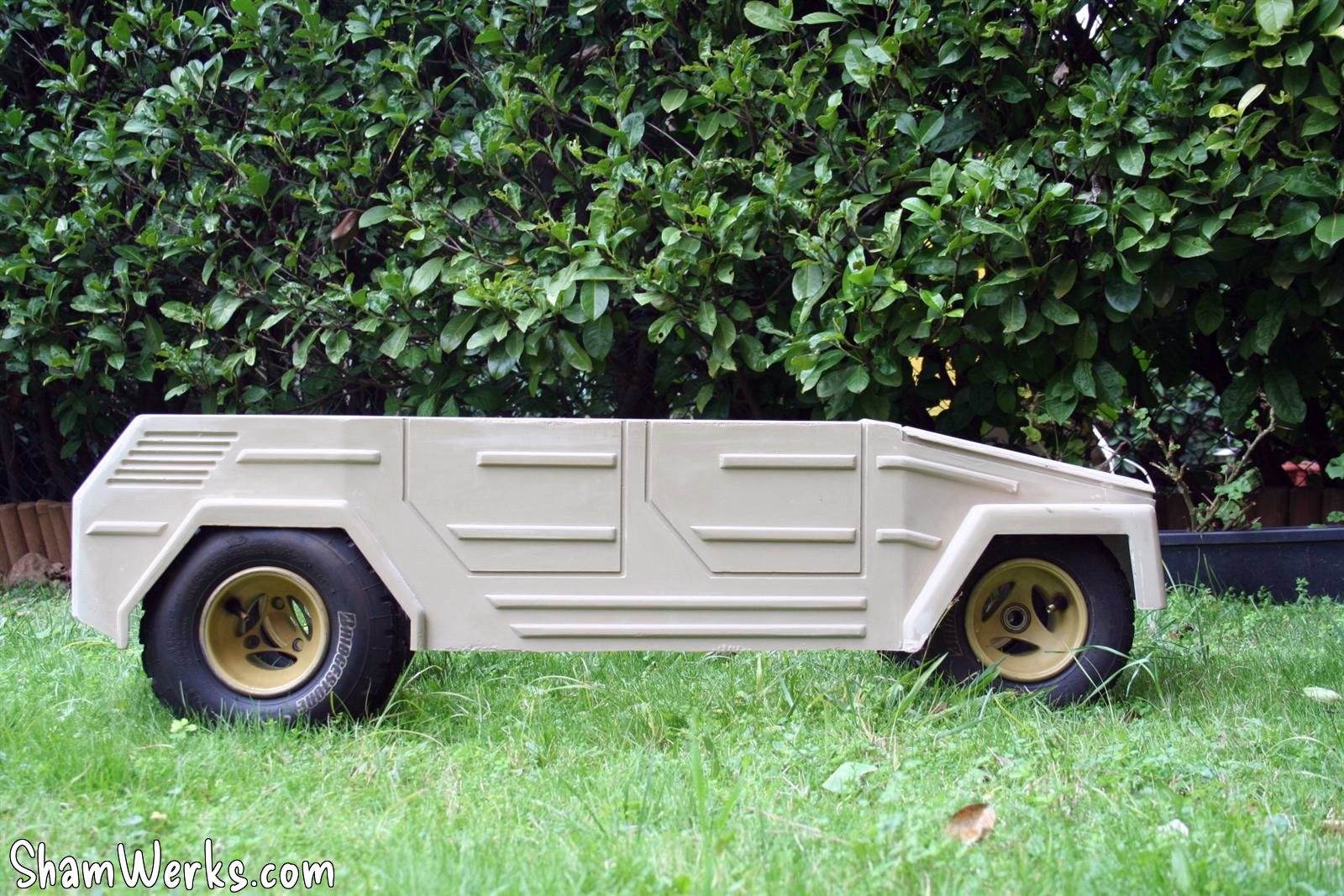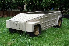 Here are some teaser pictures of the thing, the bare shell just put down on 4 karting rain-tires equipped wheels, which I will use to motorize it :