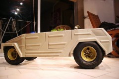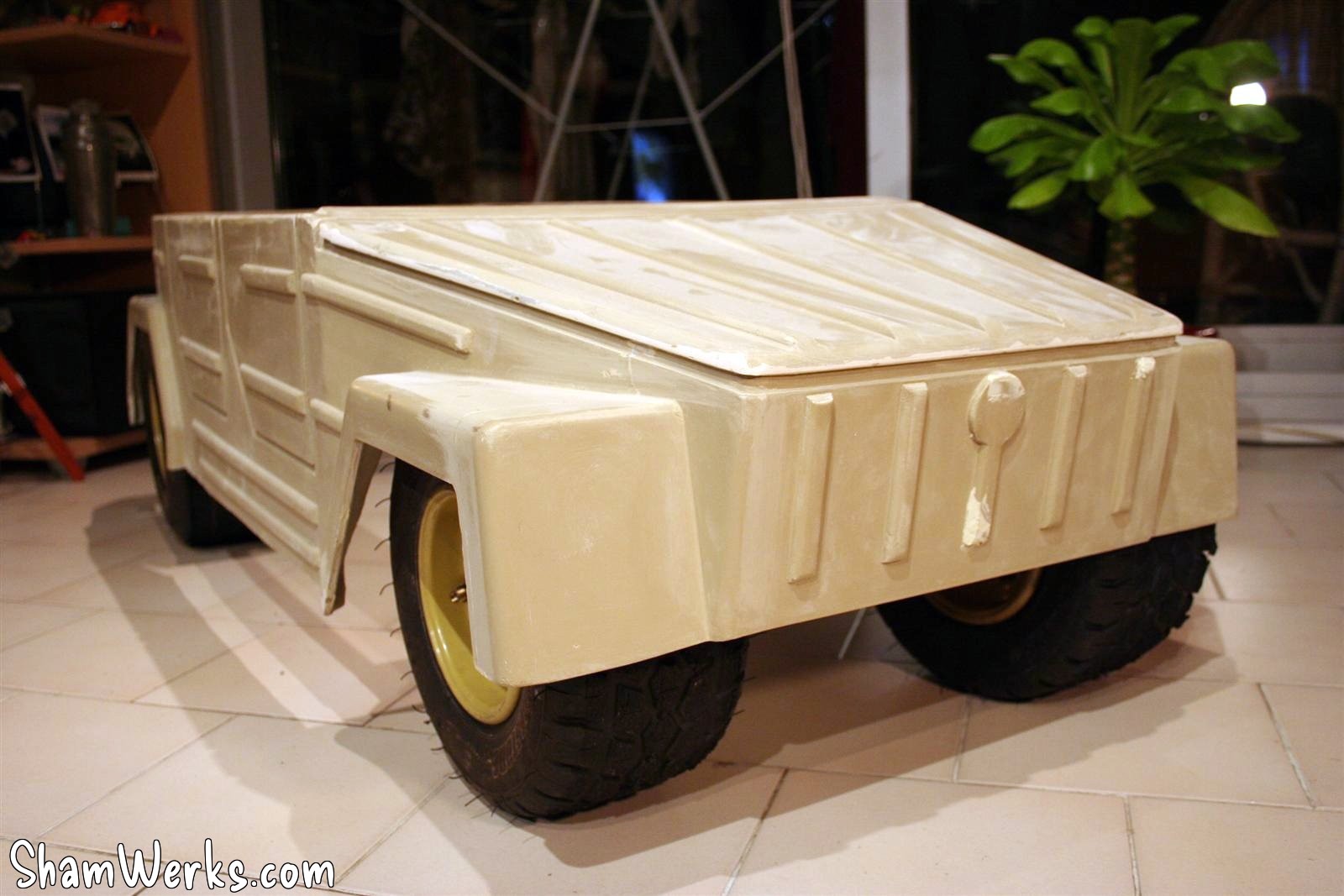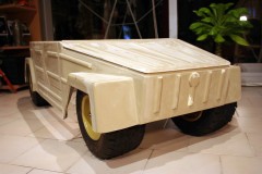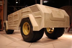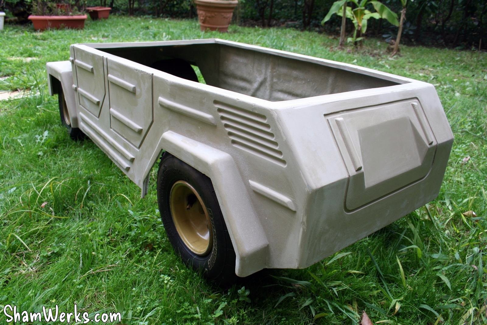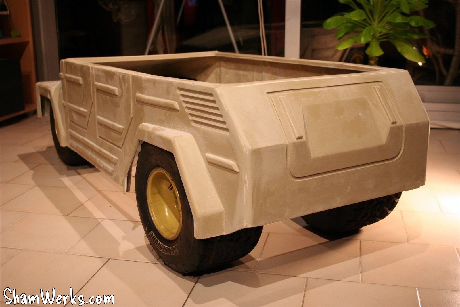 Here are some teaser pictures of the thing, the bare shell just put down on 4 karting rain-tires equipped wheels, which I will use to motorize it :