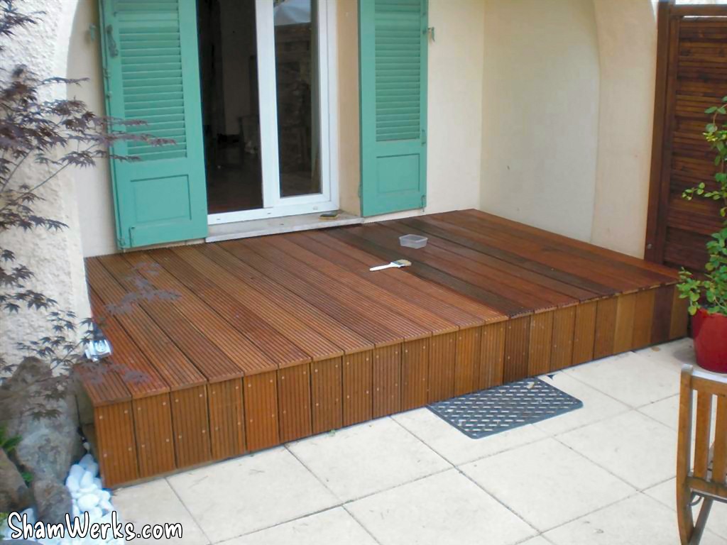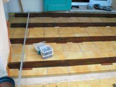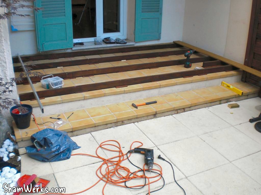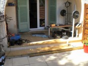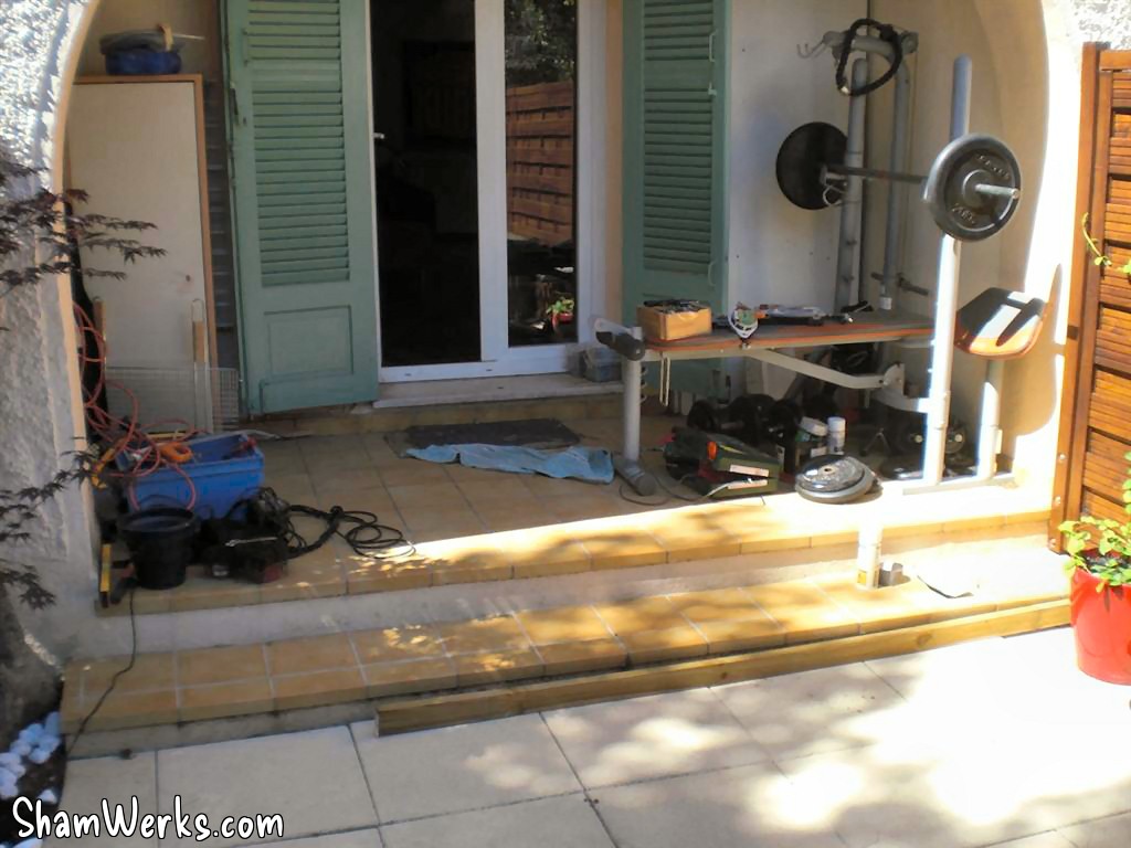 La profondeur de cette surface étant trop faible pour y faire quoi que ce soit (160cm, impossible d'y caser une table et deux chaises, ou une paire de fauteuils...), j'ai décidé de la couvrir, en faisant un prolongement de près de 40cm au dessus de la marche pour obtenir une surface exploitable. Bref, regardez les photos, c'est plus parlant.