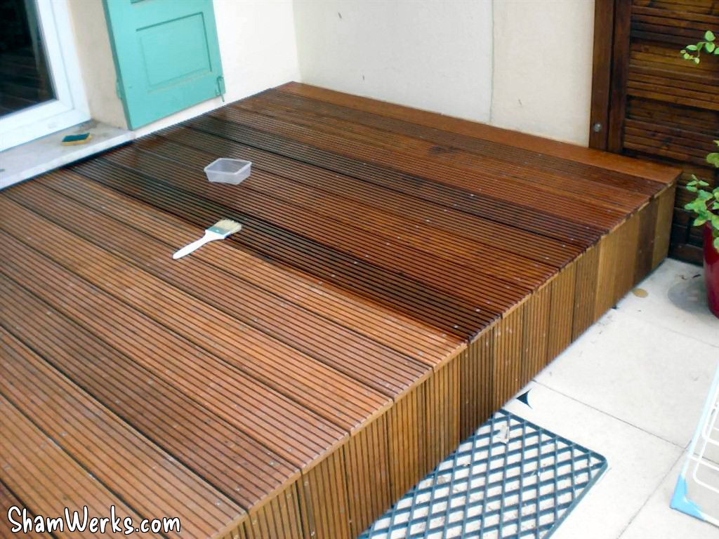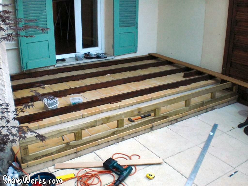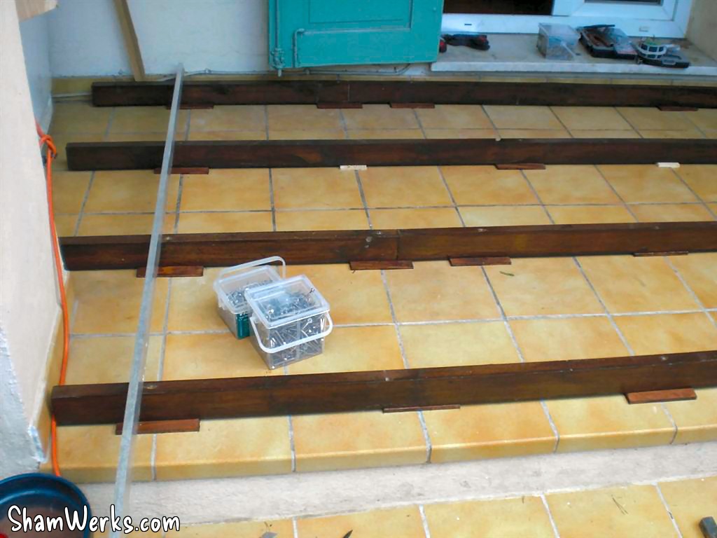 Les lambourdes sont surélevées grace à des petites plaquettes de contre-plaqué, qui permettent à l'eau de passer en dessous. C'est que moi, je compte bien nettoyer le tout au jet d'eau ensuite! 😉