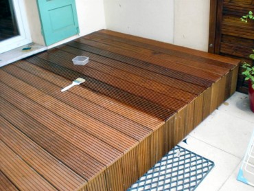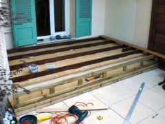 Le cadre de support sur la marche est fait de telle manière que les lames, une fois posées dessus, conservent la pente d'un centimètre par mètre de la terrasse. Les lames venant par dessus sont en Almendrillo, un bois originaire du Brésil, naturellement imputrescible.