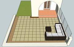 En gros, au départ, me voila avec une terrasse de 30m² (4.7m de profondeur par 6.3m de largeur) en dalles de béton posées à la va vite sur lit de sable, avec une séparation d'avec mes voisins en véritable canisse-de-polyester-naturel-qui-se-fait-la-malle-au-premier-coup-de-vent (une merveille)... On accède à la terrasse via une loggia de 5m², c'est à dire trop peu pour en faire quoi que ce soit, surtout avec son revêtement en carrelage orangé du plus bel effet...Pour y voir plus clair, j'utilise comme d'habitude Sketchup (je commence a avoir un bon niveau sur ce soft moi!) en transférant toutes les prises de mesures dedans, pour avoir une représentation virtuelle de ma terrasse : Bref. En résumé, un bel espace, du potentiel, mais rien de franchement sexy.