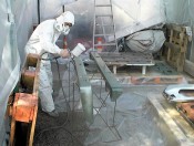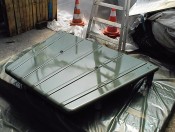 Le plancher, quant à lui, après avoir été brossé énergiquement, reçoit deux couches d'Hammerite noire satinée au pinceau (l'Hammerite est une peinture anti-rouille chargée en billes de verre, à la consistance gélatineuse, permettant d'isoler le métal de l'oxygène de l'air)... Le résultat est même mieux que je n'espérais!