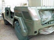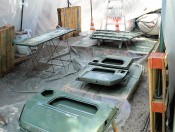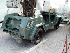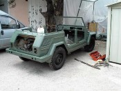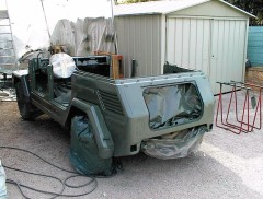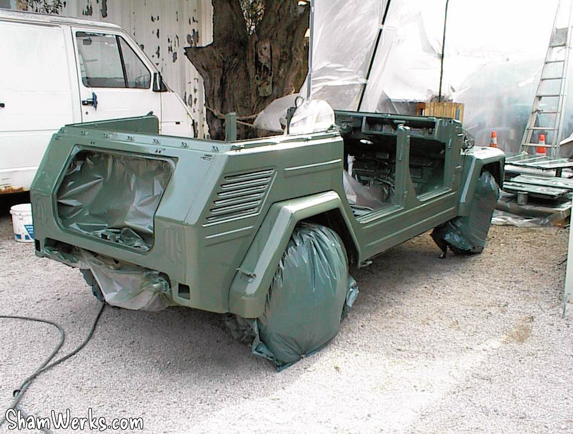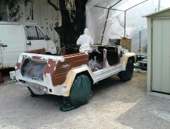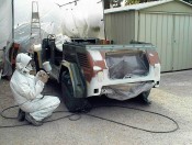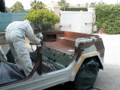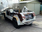 La peinture utilisée est de type industrielle (utilisée pour les camions). Ses inconvénients sont une brillance moindre et une palette de teintes disponibles réduite par rapport à de la "vraie" peinture auto (d'ailleurs, la couleur obtenue au final sur mon 181 diffère pas mal de ce que je souhaitais au départ... Pas grave, il me plait quand même!).