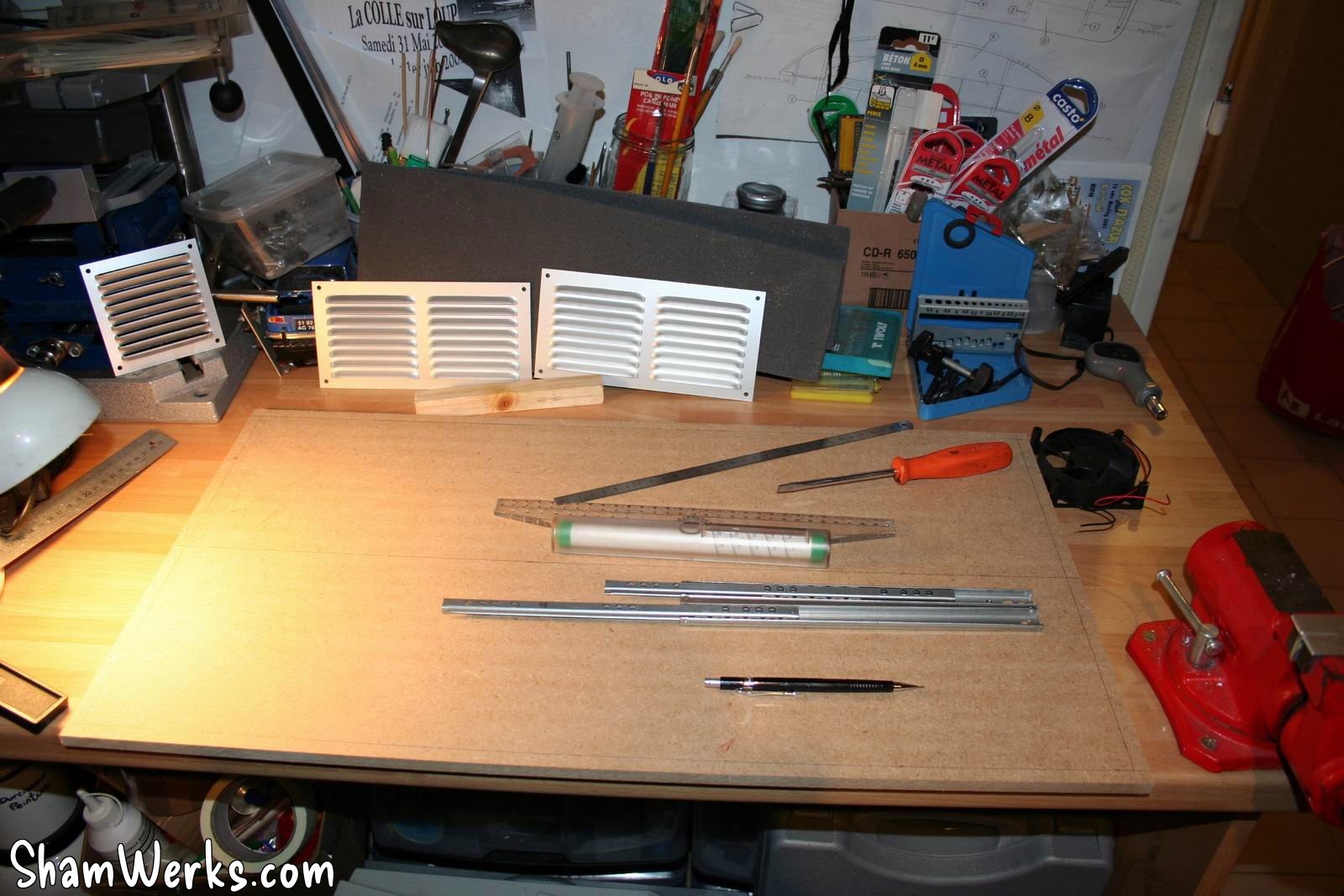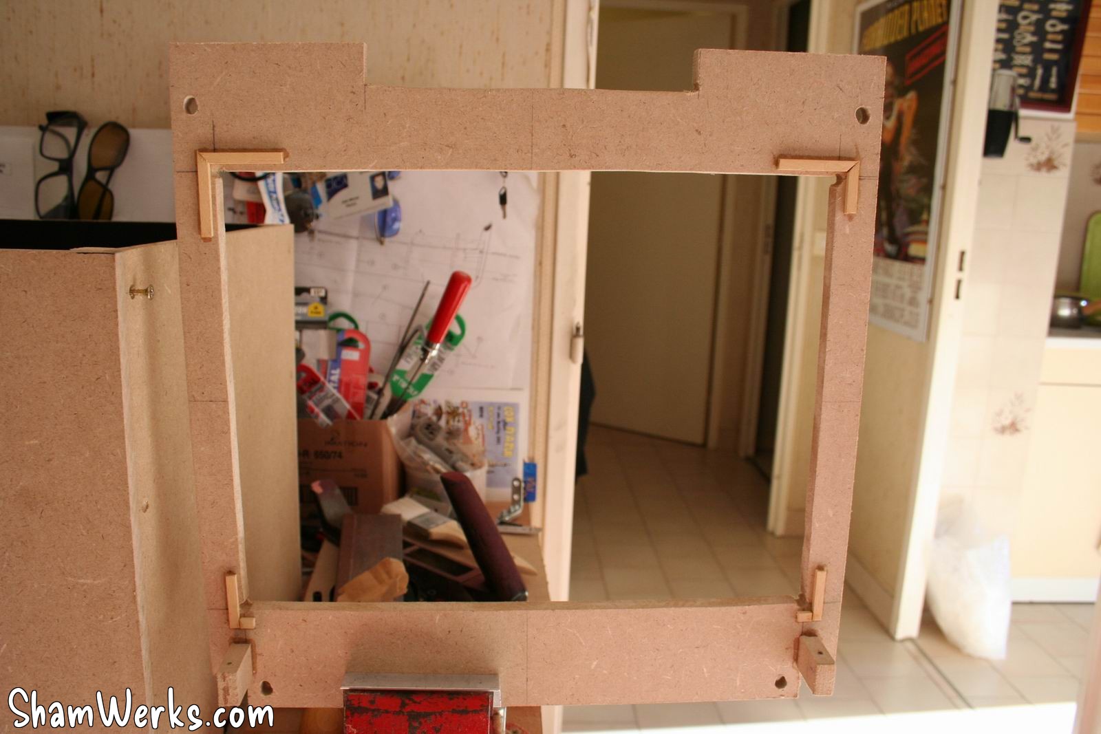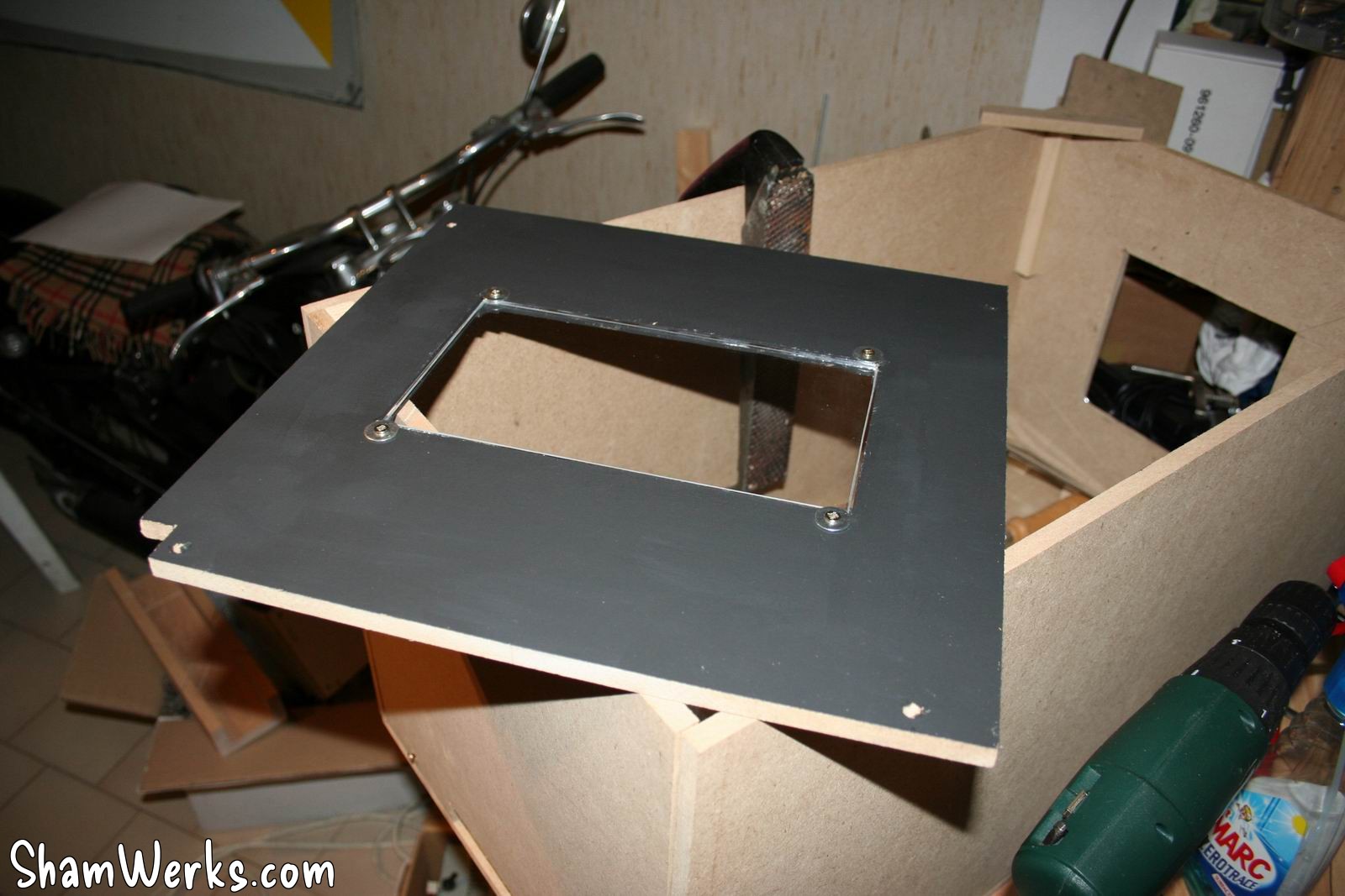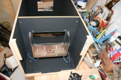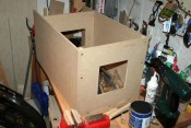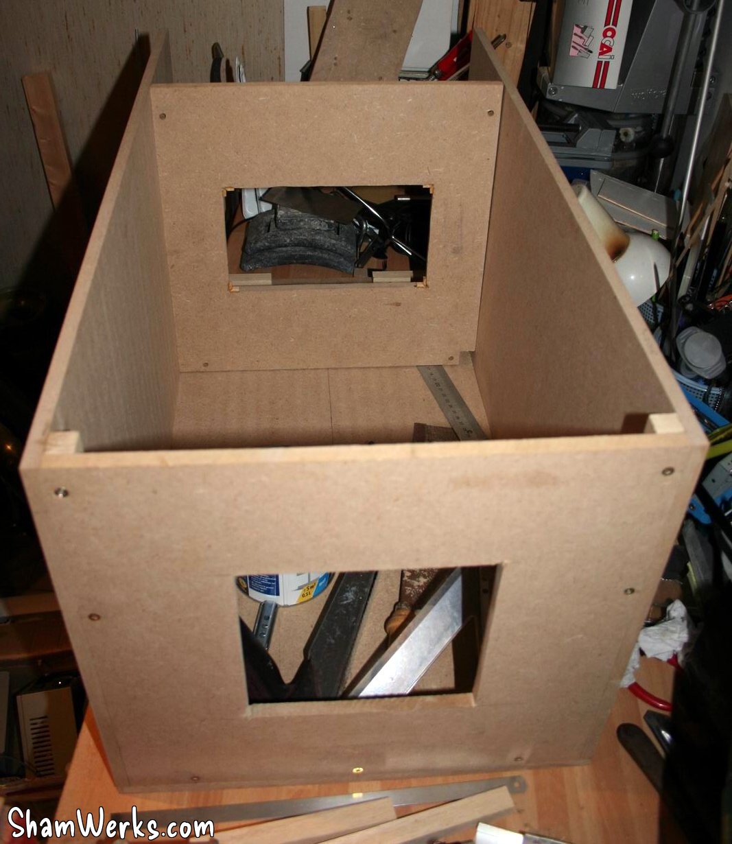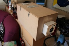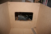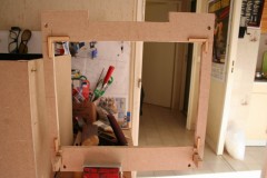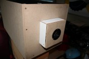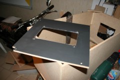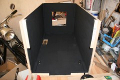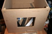 I decided to make it out of medium wood (MDF) 10mm. thick. Light, cheap, easy to work with... The box is pretty bullky : 68cm x 35cm x 35cm.