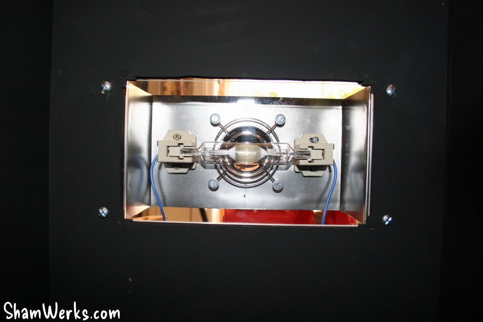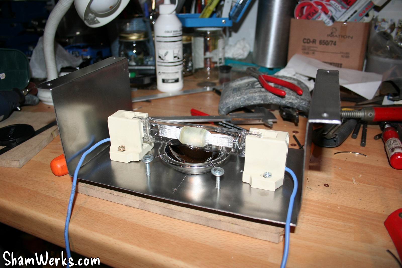 I've choosen to use a HQI lamp (mercury vapor). Benefits are a very white light (movies will end with a perfect color), and it's a ponctual light source, perfect to align the focal of all the optical elements. Plus, this lamp has a life expectancy of 10.000 hours, way more than the ones from the market's VPs ; and when it dies, it costs only a few dozen bucks to replace.