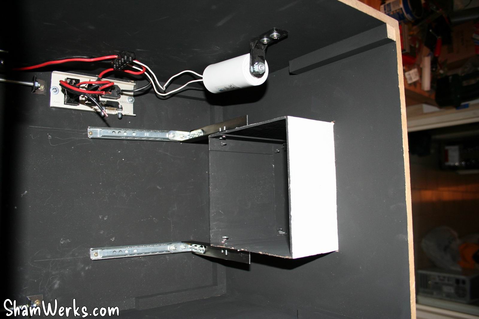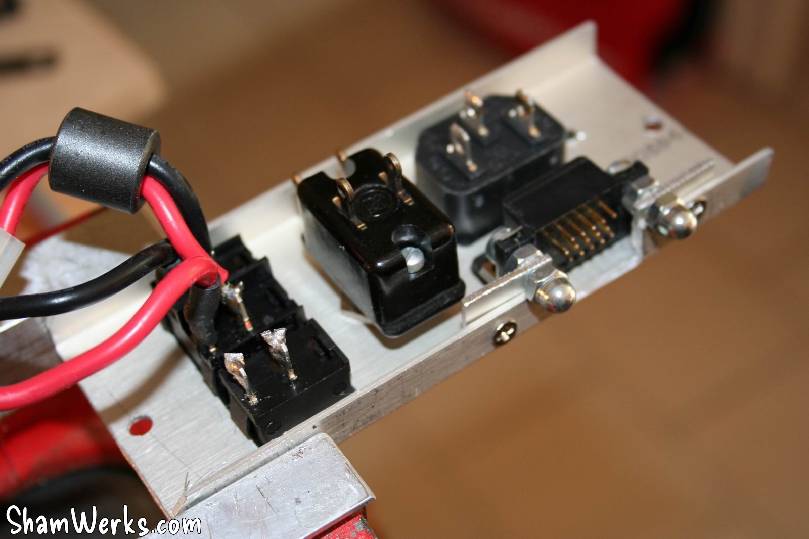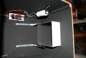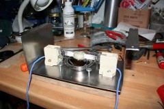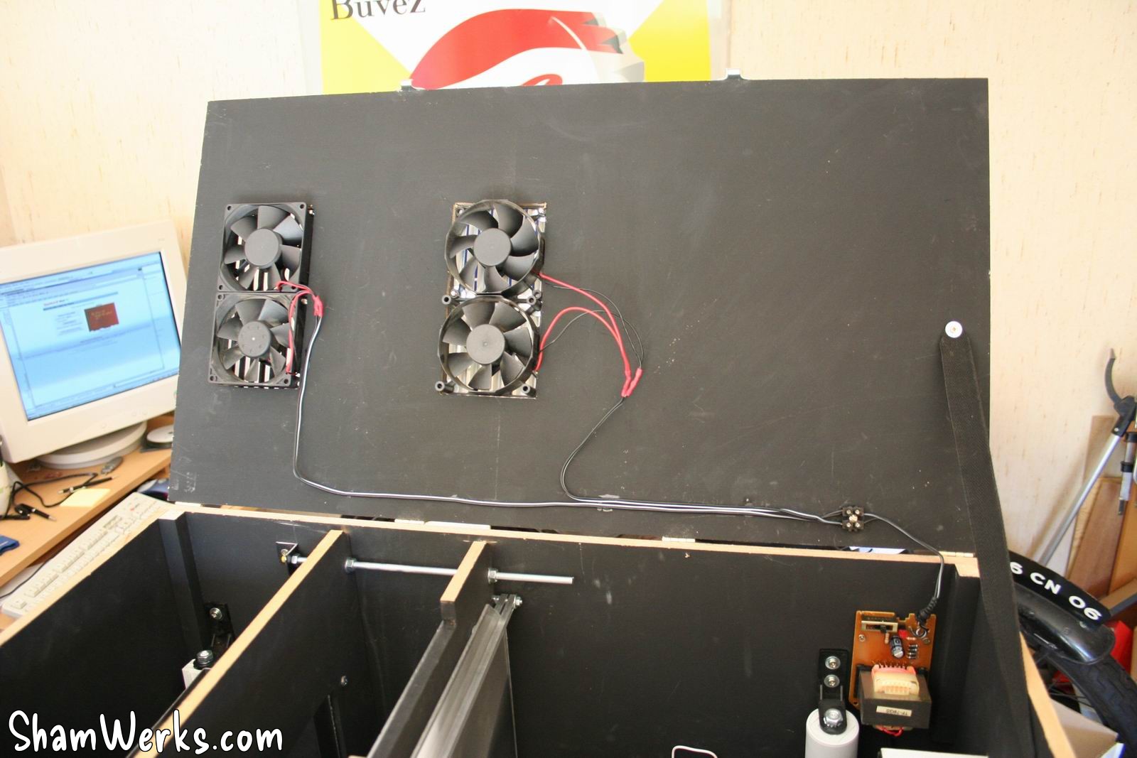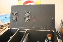 Cabling the whole thing... The transformer for the fans is adjustable, I can under-volt the fans, getting them to run slower, therefore less noisy. The four 80mm fans are directly fixed under the top cover of the box, and connected to the transformer.