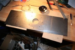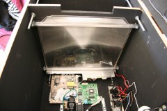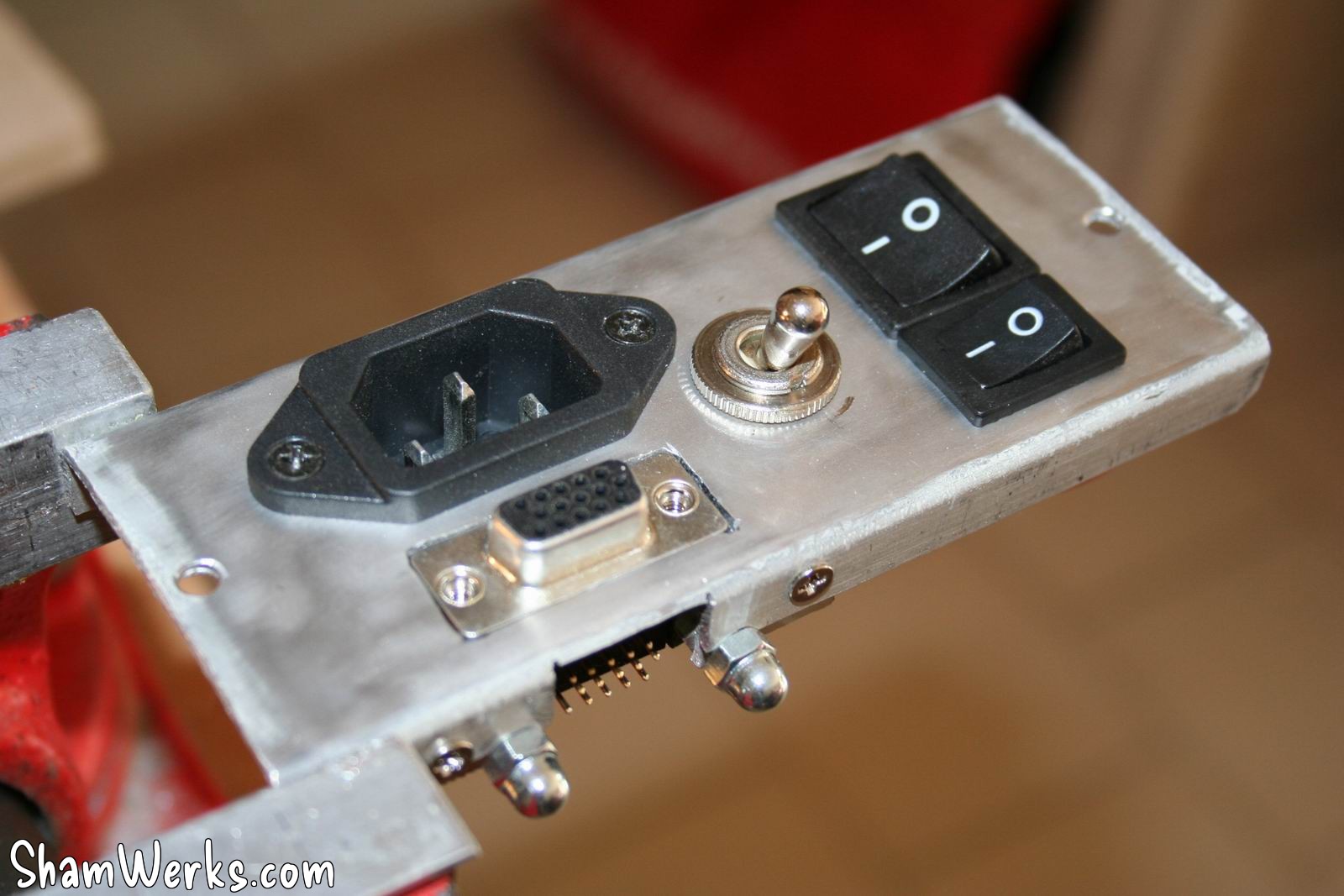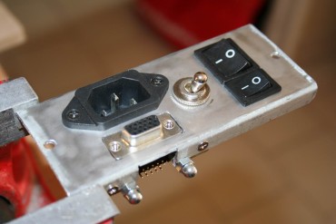 I made a little plate for the connections to the box... 220V input, VGA input (I'll remove it in the end, the final picture quality being way better without this connection), and 3 switches : one for the main power and the fans, one for the LCD, and a last one for the HQI lamp.