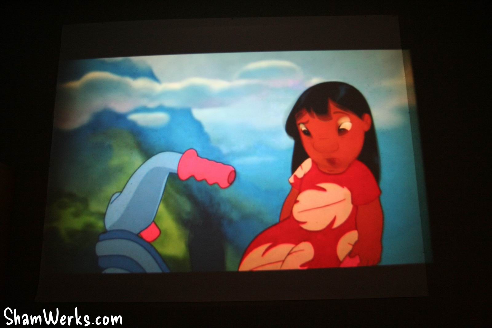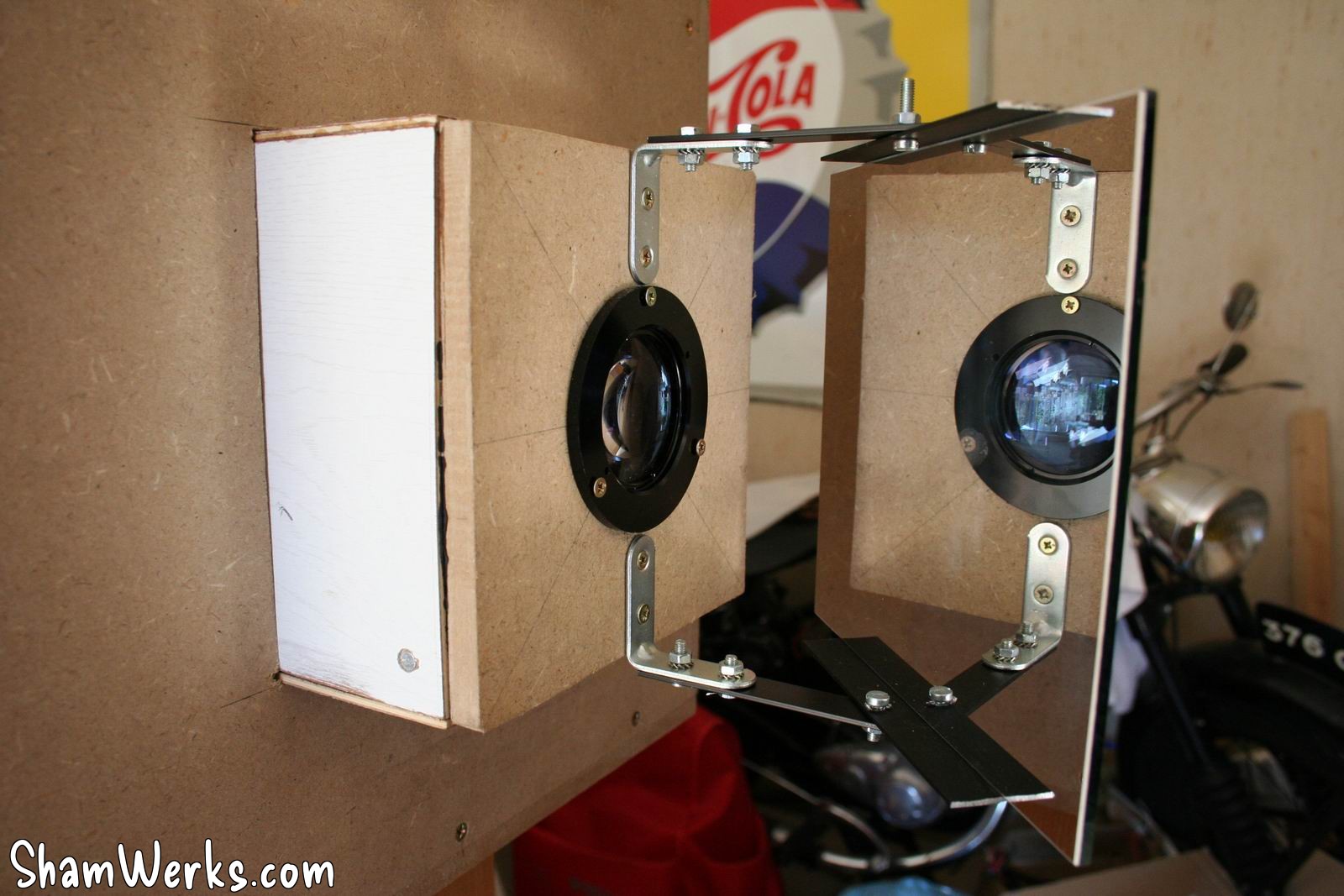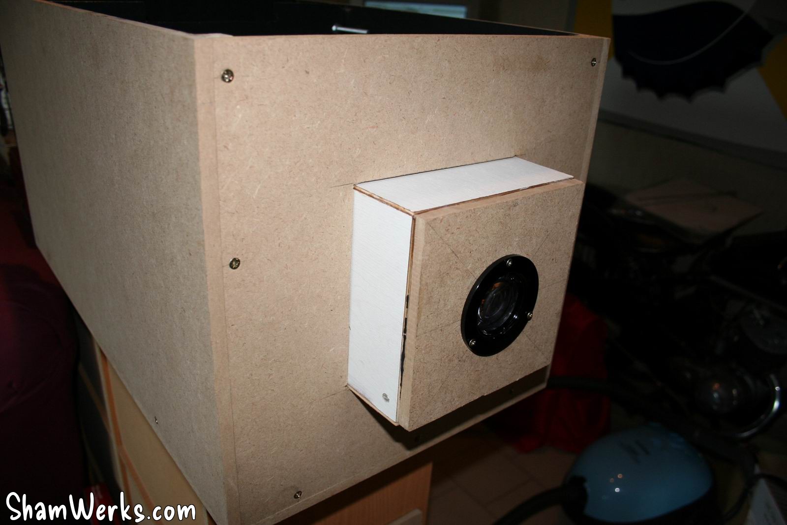 The objective holder is mounted on rails inside the box, to be able to adjust the focal to the screen distance. While playing with the objective's adjustable focal, I can adjust the projected image size.