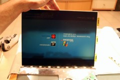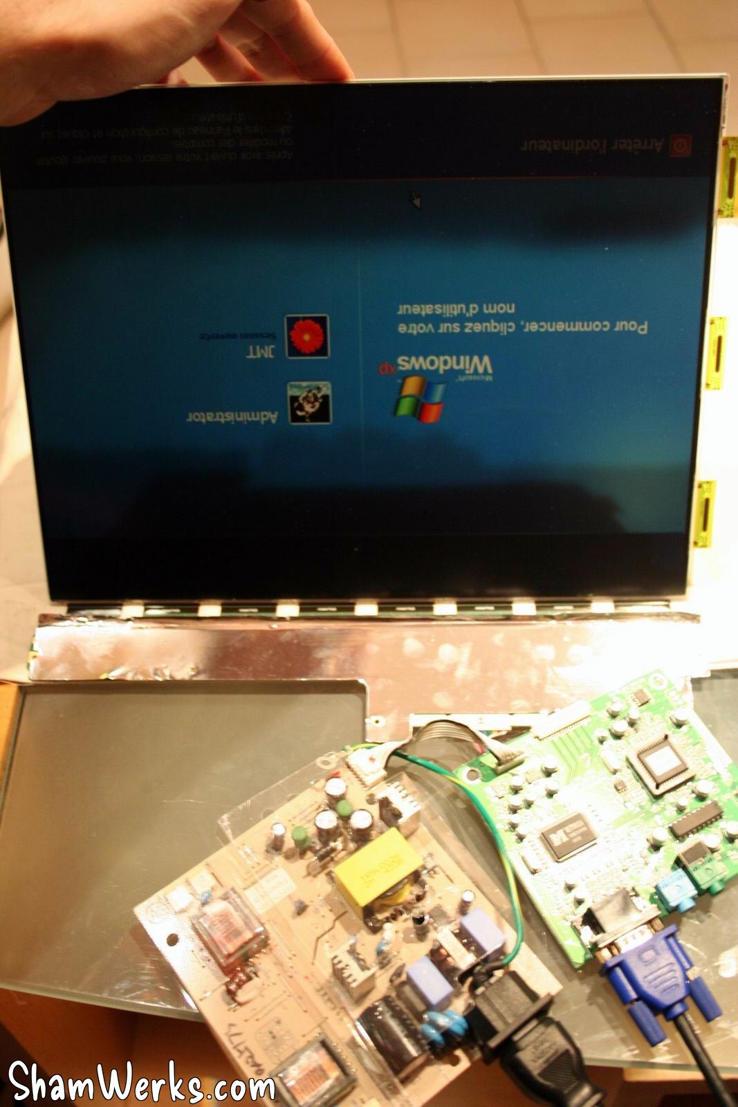 The LCD panel is naked, and plugged back "in the air" to check it is still working... Ooof, it does work! Gotta have to manipulate the panel with extreme care, it's only a very fragile 2mm thick glass panel...