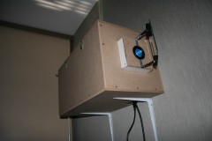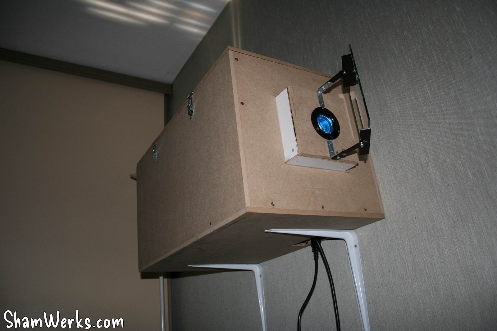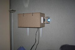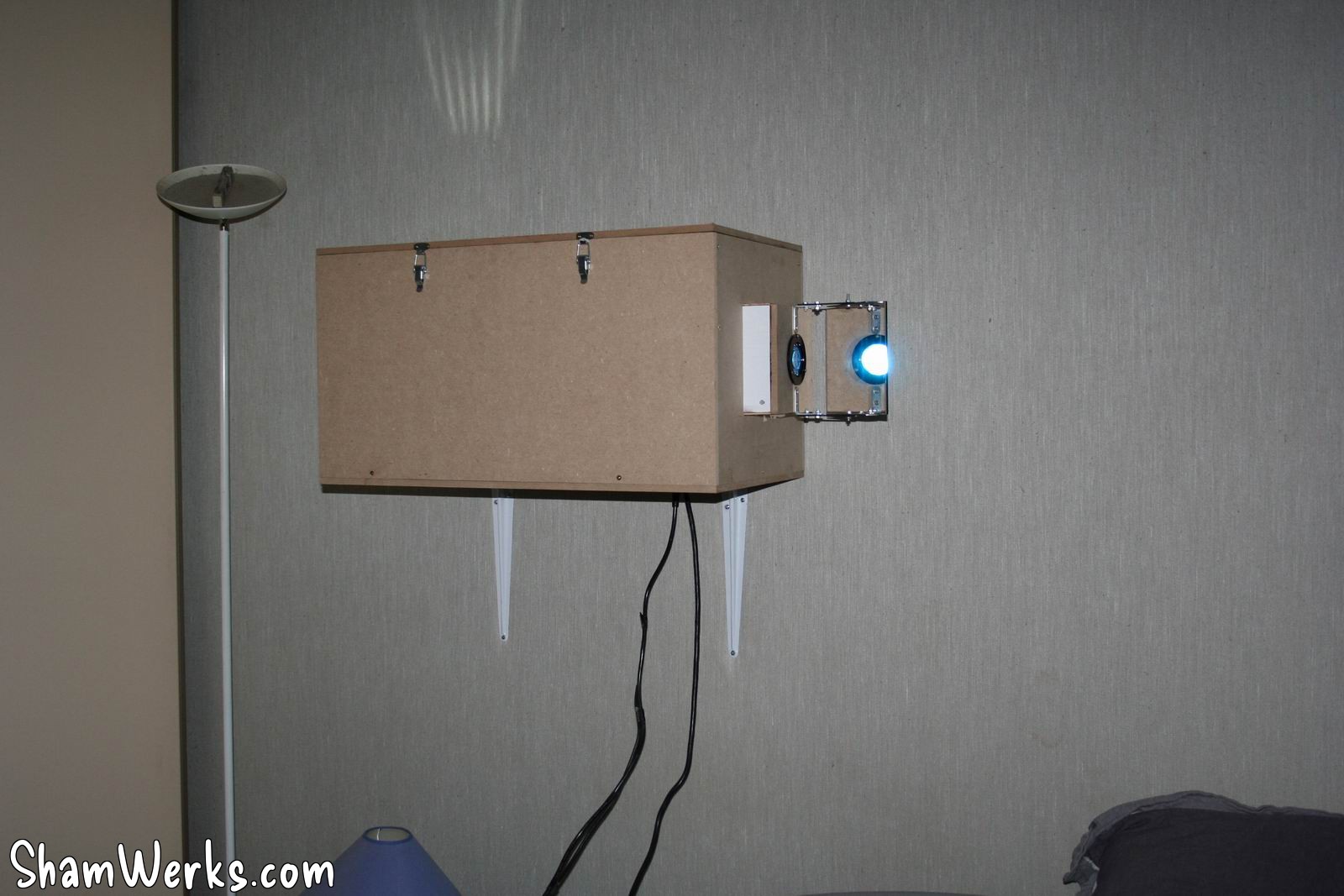 I install the box on the wall of my bedroom, and I use an Ikea Tupplur rolling curtain as a projection screen.