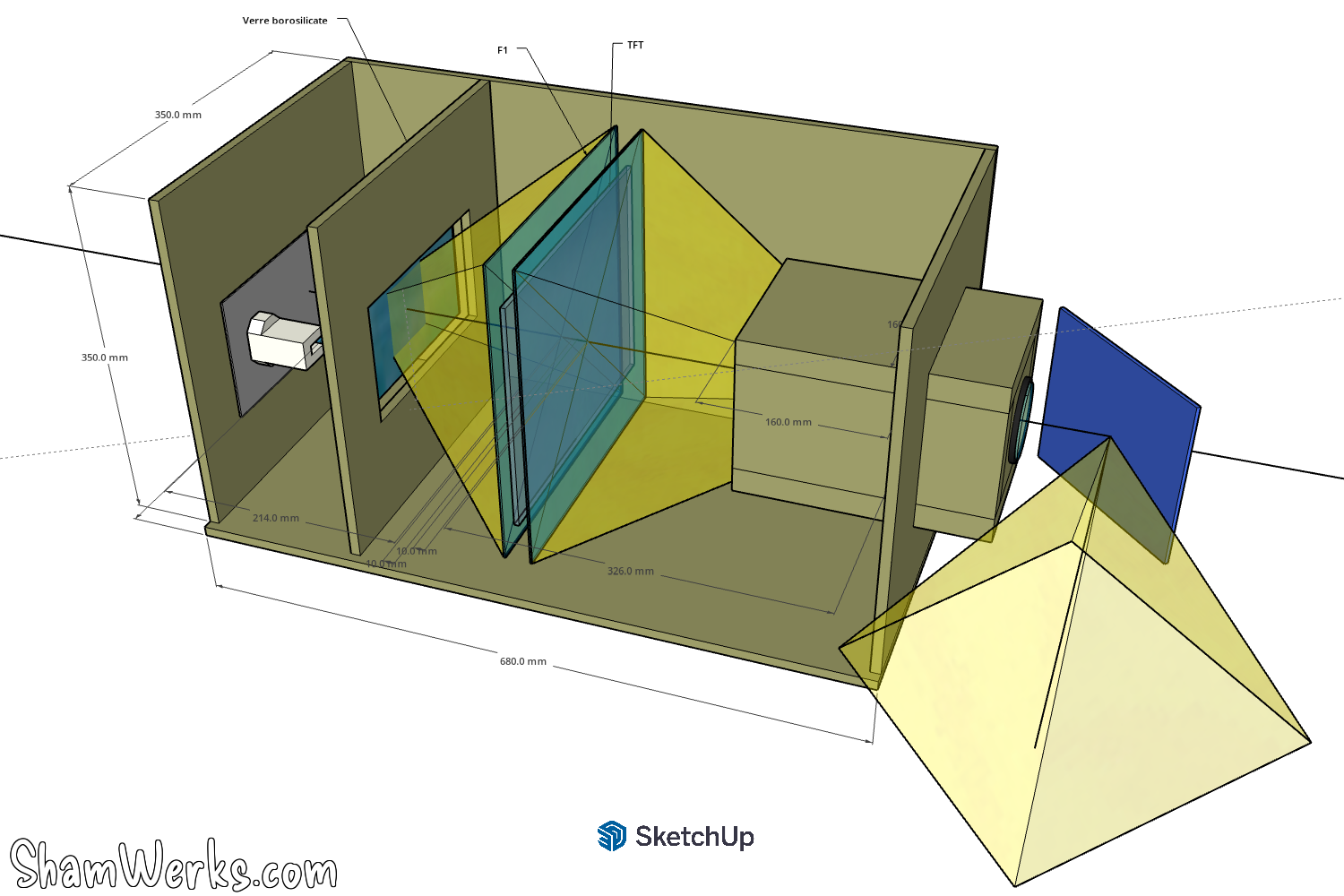 After several months defining the ideal configuration, I do 3D plans of my future video projector, to verify that my focal point calculations are coherent with the box size...