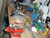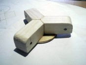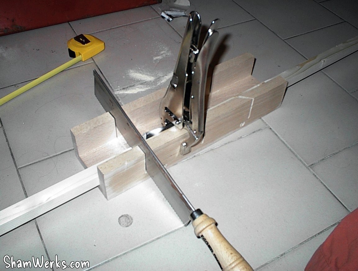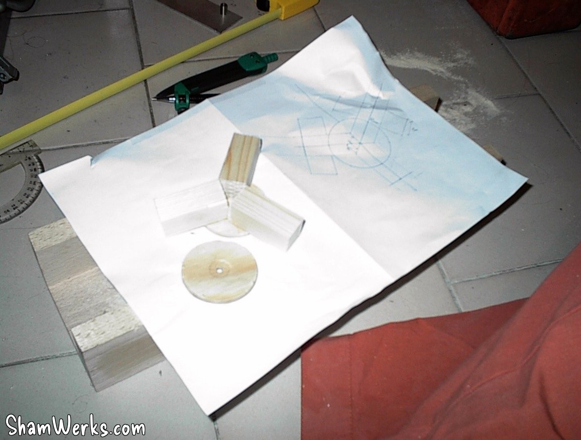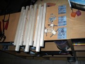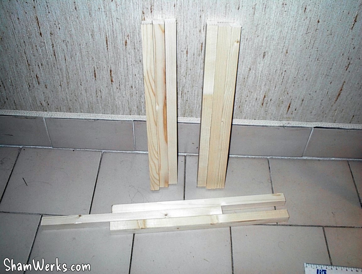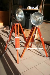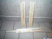 I start cutting pine wood for the tripod legs : 3 parts per leg, 3 legs per lamp, 2 lamps... It makes 18 parts to cut, sand, drill, adjust!