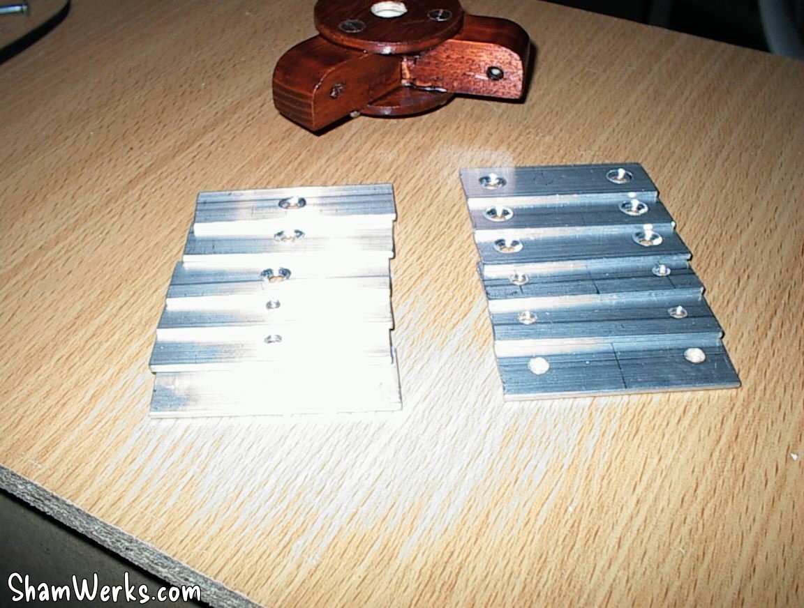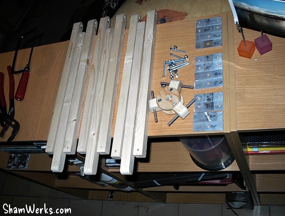 And with that, I have all the parts required to assemble one lamp : the 9 legs parts of pine wood, the tripod head, some screws and bolts... And 12 aluminium plates to cut, grind and drill!