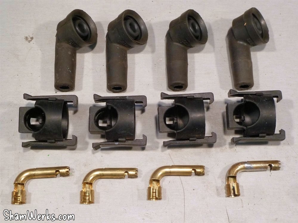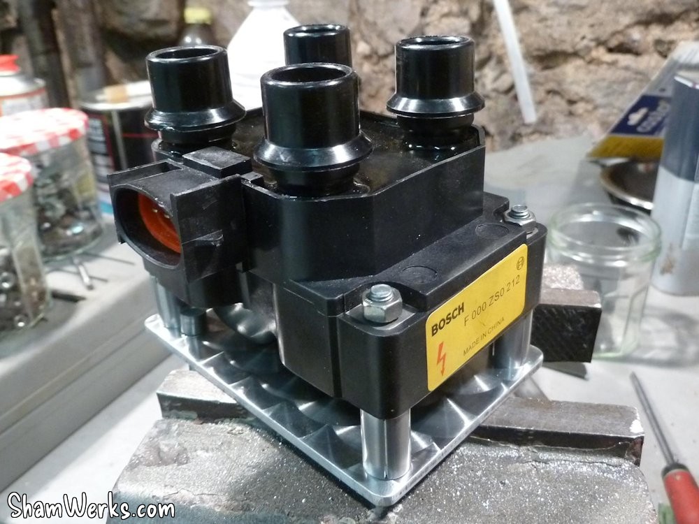 My ignition will rely on a dual-coil (wasted spark), directly controled by the MS : no Ford EDIS module in the middle, so that I can control the Dwell from my MS... And more important, no more distributor!I use a Ford dual coil (originally installed in Fiesta/Escort models, ref. Bosch F000ZS0212), but it needs specific clips to fit the wires on it... So I make a set of lead wires by taking a set of clips from Ford Fiesta wires, and grafting them on a VW Taylor 8mm set of wires.