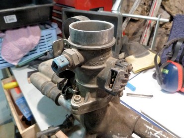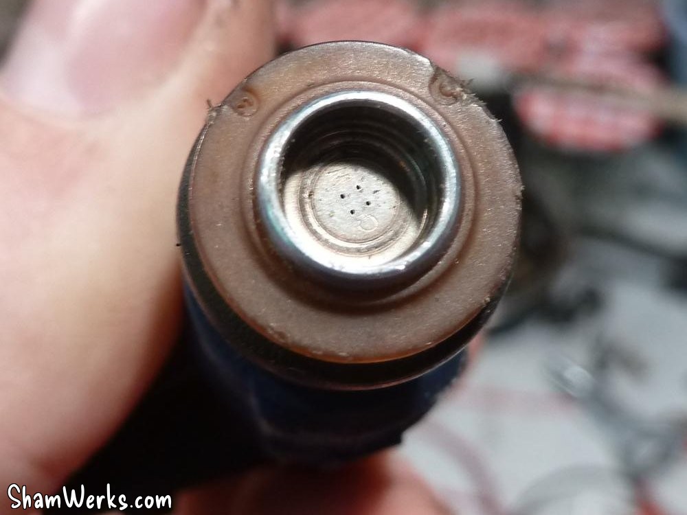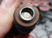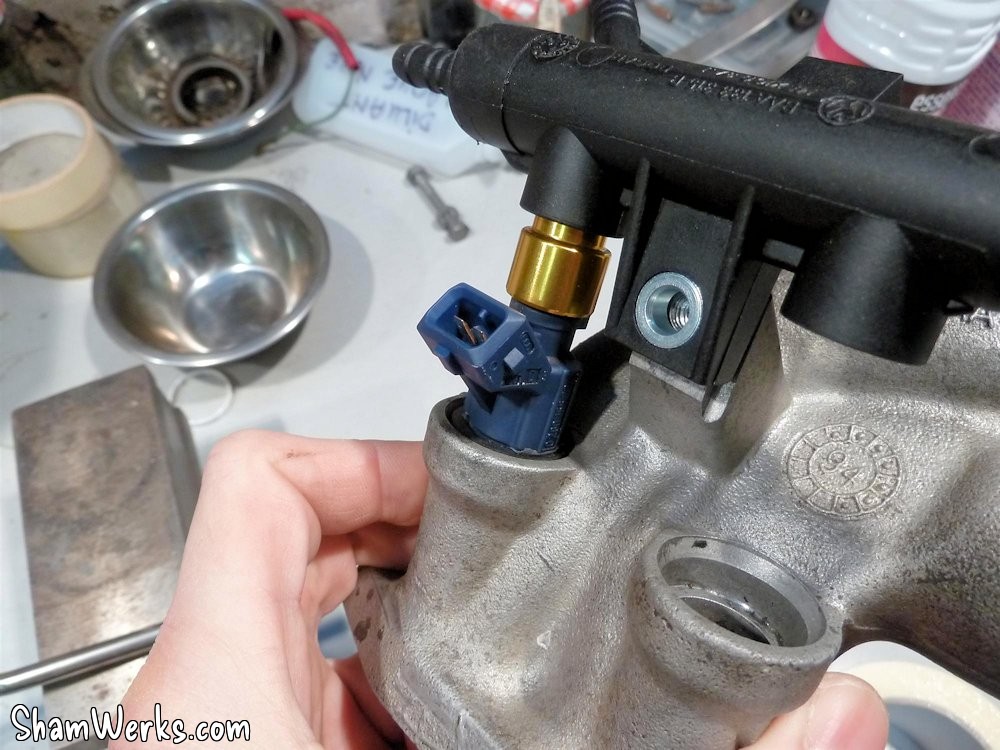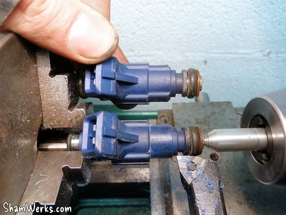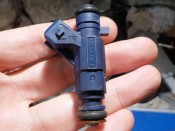 The original Mex injector were "EV1", an old generation of injectors, which output flow looks like one of a supersoaker water gun (single hole output)... I wanted to switch to EV6 (multiple holes output) to get a better air-fuel mix (see this video to understand the flow between these two generations).Not that easy to find from smaller engines. Finally, I ended up adapting injectors from a Citroën Saxo VTR (Bosch ref.0280155794, 135cc @3bar) which look pretty good to me, and you can find used ones for cheap. I lathe them down a bit to adjust'em, and I can install them via a small adapter (see here).
