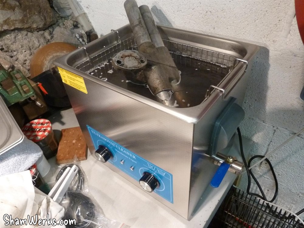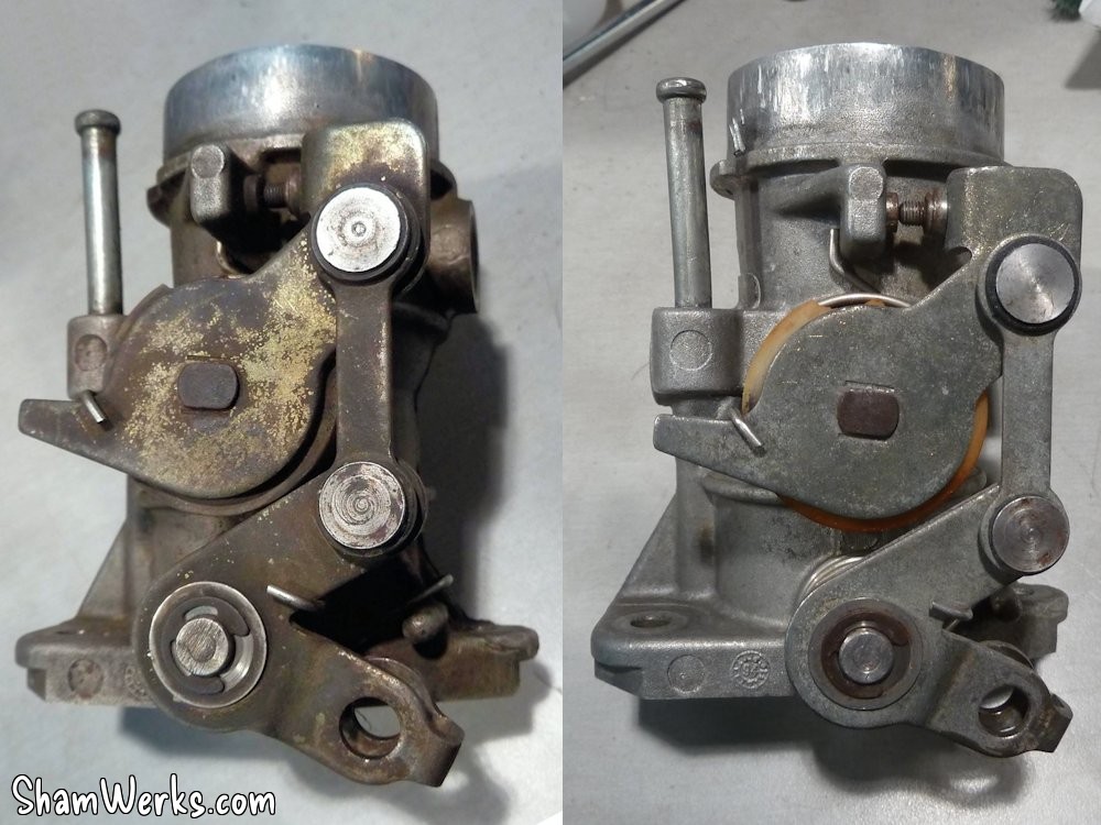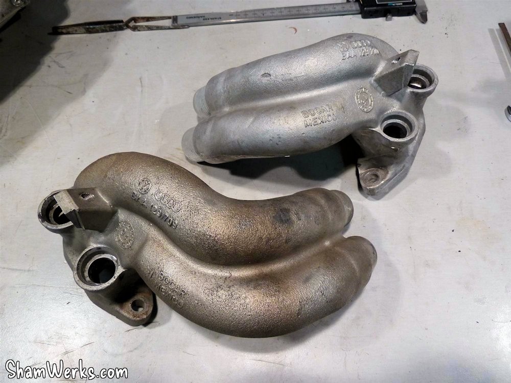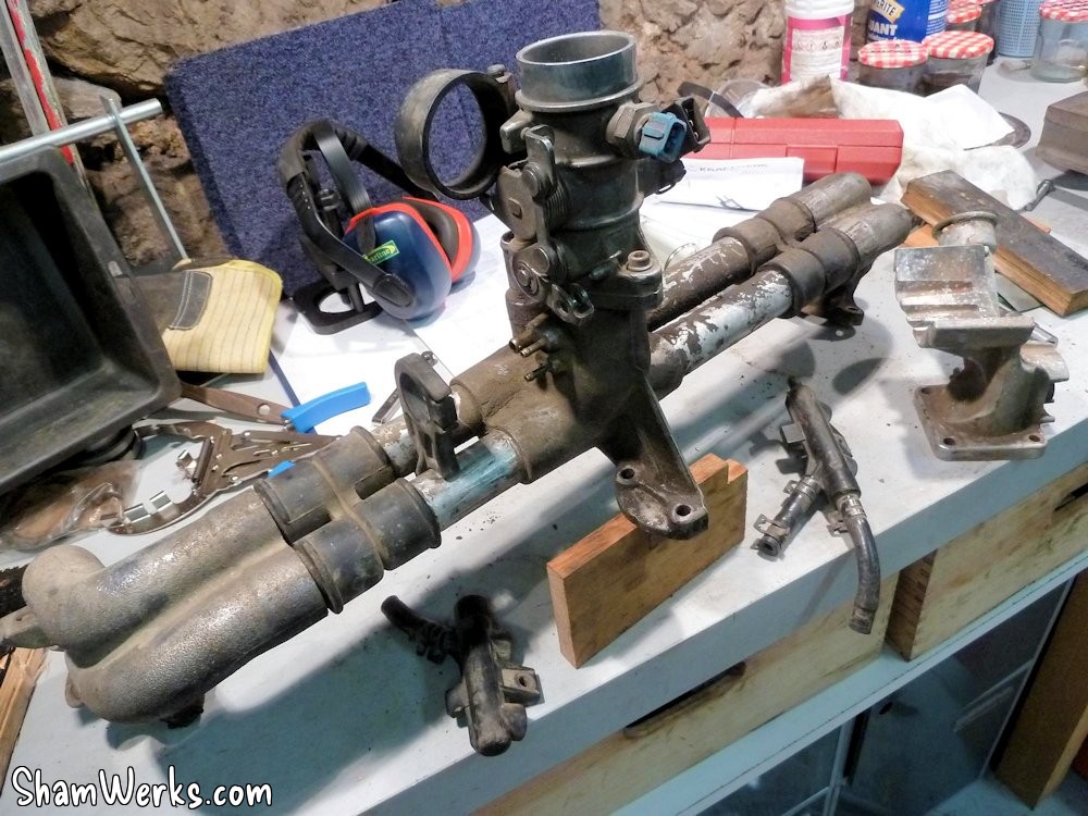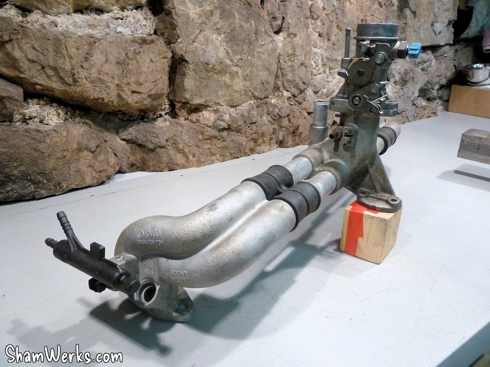 On the intake side, I'm using parts from the 1600i engines that were installed on the last Mexican Beetles : complete intake manifold/plenum, throttle body, and alternator stand. (thanks Laurent!)A thorough cleaning (beadblasting or ultrasound bath, depending on the parts), a couple of new gaskets, and it's ready to go!