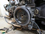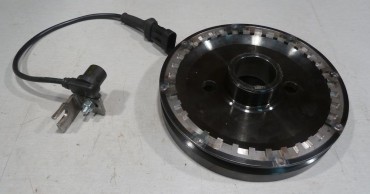 I just replaced the original connector with a more widely, waterproof model : it connects on the shielded cable running to the MS box. Before I went on and install the pulley on the engine, I wanted to make sure everything worked fine, test the sensitivity of the sensor, its wiring, etc... So I mounted the pulley and sensor on my lathe to give it a spin, via a DB37 I made for this purpose, with only power and sensor input welded on (and yes, I'm listening to BBC News in my garage!) :