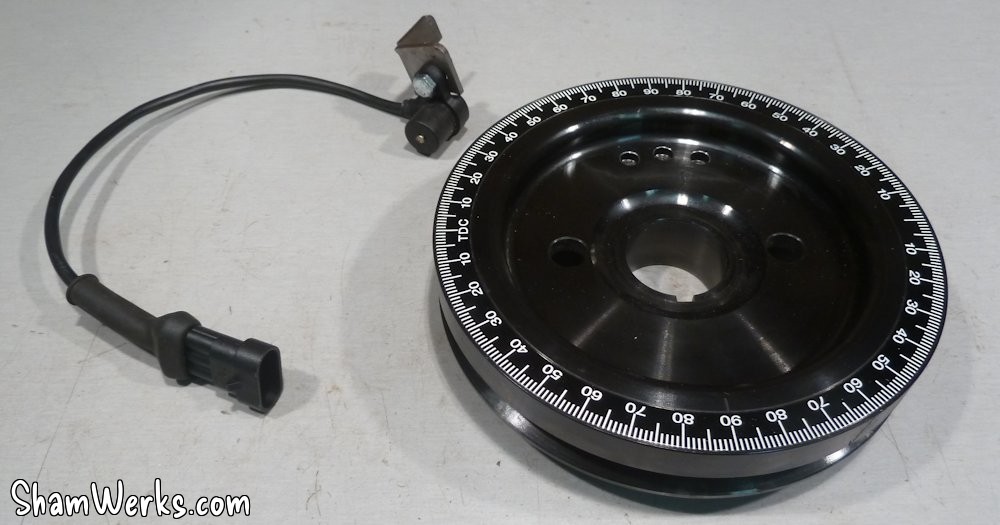 One of the tricky points of the whole install is the having an accurate, reliable (and possibly stealth) TCD sensor. 😉I went with TheDubShop's solution (excellent contact with Mario Velotta), with the damper pulley (Black Equalizer 2.6kg/5.5lb) that I got balanced (Feller Service). It's installed with a longer screw from Gene Berg.