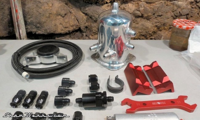 I wanted to avoid having to drill/weld my fuel tank for the return line, so I went for a 1 liter surge tank (swirl pot), installed right below my fuel tank, and gravity fed (found on eBay UK at Demon Motorsports, for something like 40€). It should avoid the pump from sucking air in sharp turns when fuel tank level is getting low. Well I guess I'll see how it turns out in driving conditions...