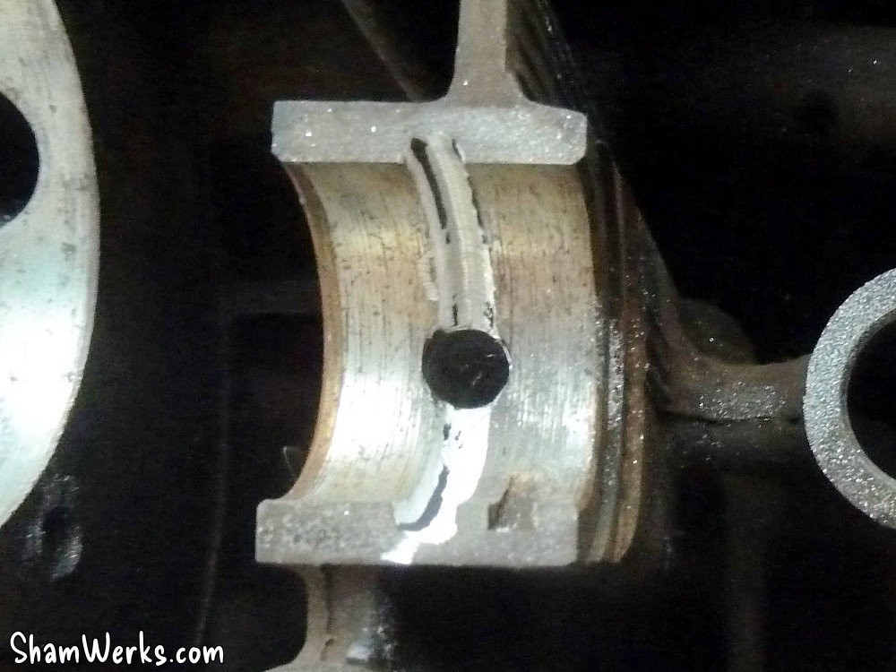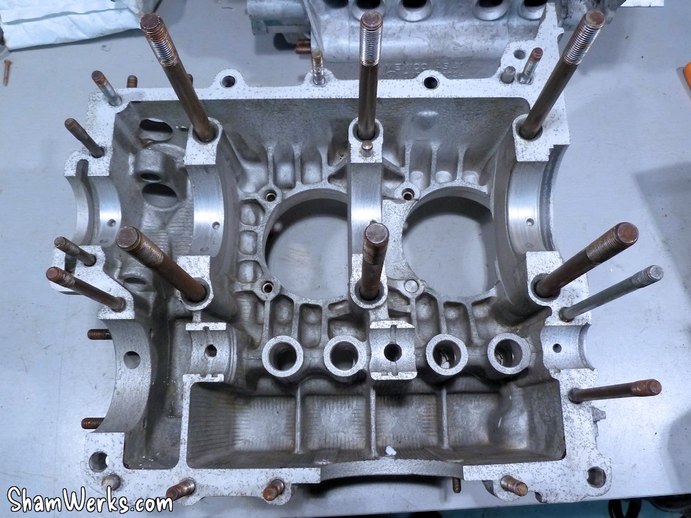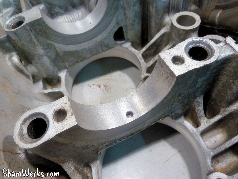 Je lui fais quelques modifications de mon coté, tirées des "sermons de Bob Hoover", ce qu'il appelait les "modifications HVX" (voir sur son blog ici, et là). A lire aussi si vous voulez vous lancer, ce post et ce post de Vince/PanelVan qui explique très bien la manip.L'idée, c'est que d'origine le carter droit du moteur n'est alimenté en huile que via les nervures autour du palier central de l'arbre à cames (cf. schéma ci-dessous). Ce n'est pas idéal, parce que du coup les poussoirs/culbuteurs/soupapes de droite (cylindres 1 et 2) sont moins bien lubrifiés/refroidis qu'à gauche (cylindres 3 et 4).