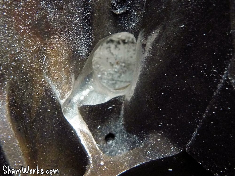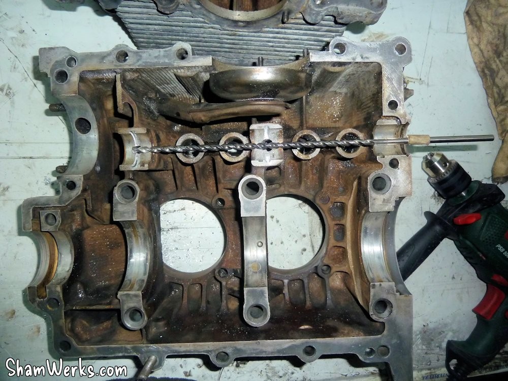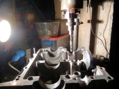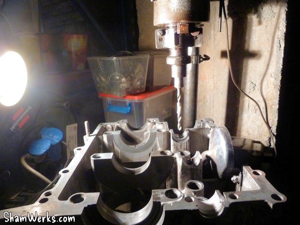 On commence par forer à la perceuse à 9mm, ensuite on agrandi à la fraiseuse pneumatique avec des fraises carbure. Si elles sont en bon état, elles rentrent dans le magnésium du carter comme dans du beurre!