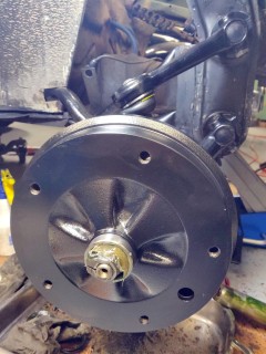 Pour adapter la couronne sur l'axe arrière, j'utilise un moyeux porte-couronne de disques que j'avais sur un de mes châssis. Réduction au tour à métaux pour l'adapter, 6 taraudages M6, et zou.
