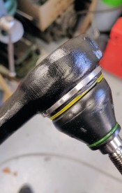 Les 4 rotules de suspension avaient été changées par le précédent proprio, mais le mécano ne les avait pas montées alignées correctement avec le marquage sur le bras ; du coup après avoir roulé un peu, elles ont été ressorties, puis re-pressées dans les bras (truc à ne surtout pas faire).