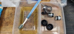 J'essaye de trouver les rotules de meilleure qualité que les Meyle "German-fabriquées-en-Turquie" précédemment montées, qui n'ont pas bonne réputation - je finis avec une paire de TRW en haut (trouvées sur eBay US - très belle came, mais rare et au prix fort) et de Heyd en bas (chez Paruzzi aux Pays Bas).