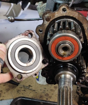 Contrôle des roulements des réducteurs : ils ont été remplacés par le précédent proprio, ils sont neufs, mais c'est des modèles étanches : j'aurais préféré la circulation d'huile d'origine, mais je décide de les garder quand même... Je remonte en refaisant toute l'étanchéité (joints papier + spi neufs, et Loctite 518 anaérobie)