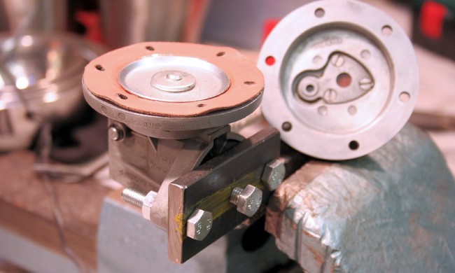 I finally just have to mount the membrane with a thin coat of grease, so that it slides smoothly in place, avoiding any "wrinkle" that may cause a leak... And BAM, an as-new fuel pump ! The inside is packed with grease, and it goes back on the engine.