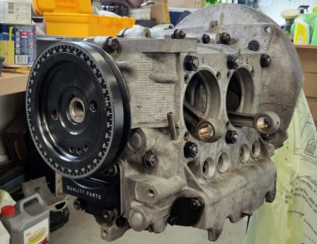 Bien que le vilo soit vendu comme étant déjà équilibré, je le fais quand même équilibrer derrière (chez Feller), avec volant moteur et mécanisme d'embrayage ; la poulie damper avait déjà été équilibrée de son côté. Au moins, j'aurais une ligne qui tourne sans balourd! (merci Loïc pour le prêt de ton support vilo pour l'expédition)