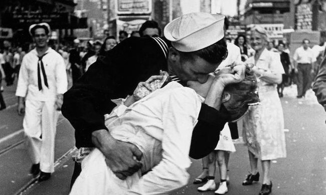 That kiss was shot on Time Square (New York) by Alfred Eisenstaedt on August 15, 1945 : on that very day, Japan surrendered without conditions (cf. previous article), ending the 6 long years of conflict of World War II.