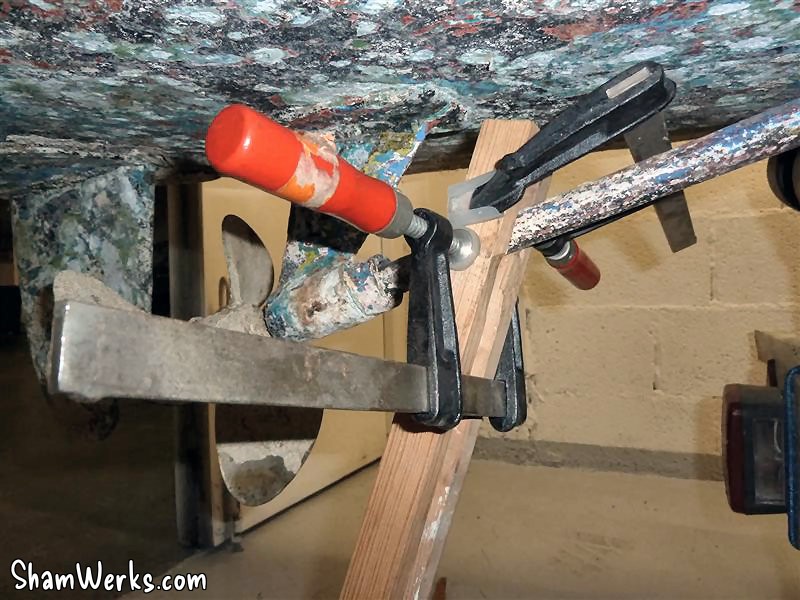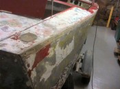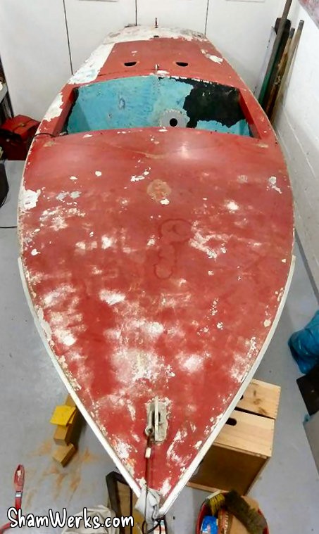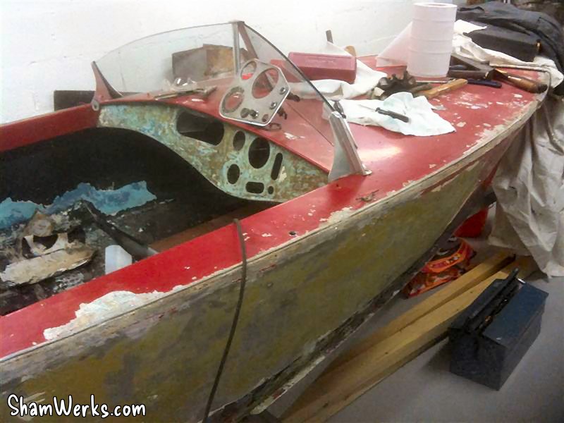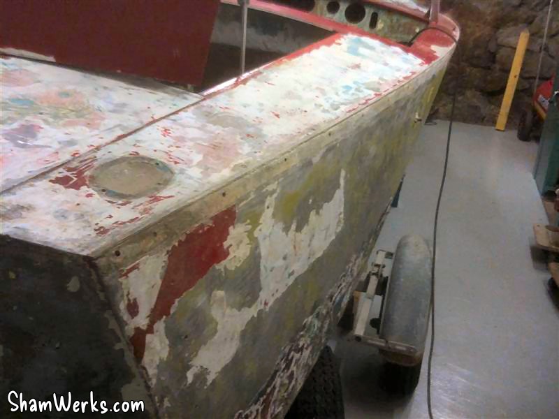The next challenge will be to take the rudder out, since its nut is not only rusted but as well pretty much inaccessible... And it must go, unless the prop shaft won't leave either. 😔 I think I'll take the hull to sandblasting, but to prevent the blaster from using excessive air pressure (which would buckle the aluminium panels), I want to bring the boat already scraped from most of the bondo+paint layers currently covering it. It's a slow process ; the heat gun is a great tool for that.