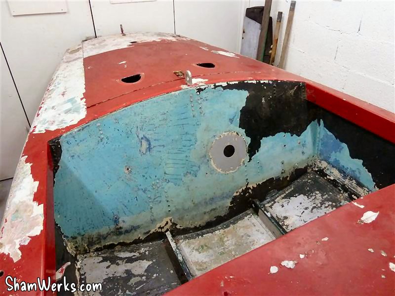 In order to sandblast the hull, it also needs to be totally bare from any accessories. Everything must go! So I keep unscrewing stuff... Which is far from easy, since the 100 stainless steel screws had a galvanic reaction with the aluminium hull!