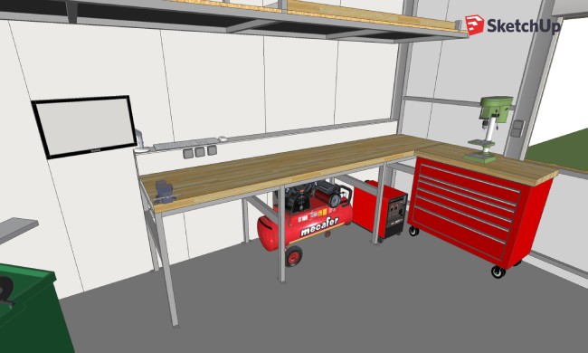 Allez, on y va : si ce n'est pas la première fois que vous venez ici, vous connaissez la boutique, ma première étape c'est Sketchup pour trouver la meilleure configuration : Le résultat fait 3m15 de long pour 80cm de profondeur, et 1m de haut parce que je suis grand et que je me casse le dos sur une hauteur standard...Initialement j'avais prévu de mettre ma servante en dessous, mais ça devenait alors trop haut, surtout que j'ai une mezzanine de stockage à 2m10 au-dessus. Du coup je mettrai plutôt la servante sur le côté, avec un morceau de plan de travail dessus, pour avoir un établi complet en "L". Y'a plus qu’à!