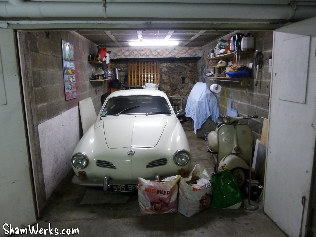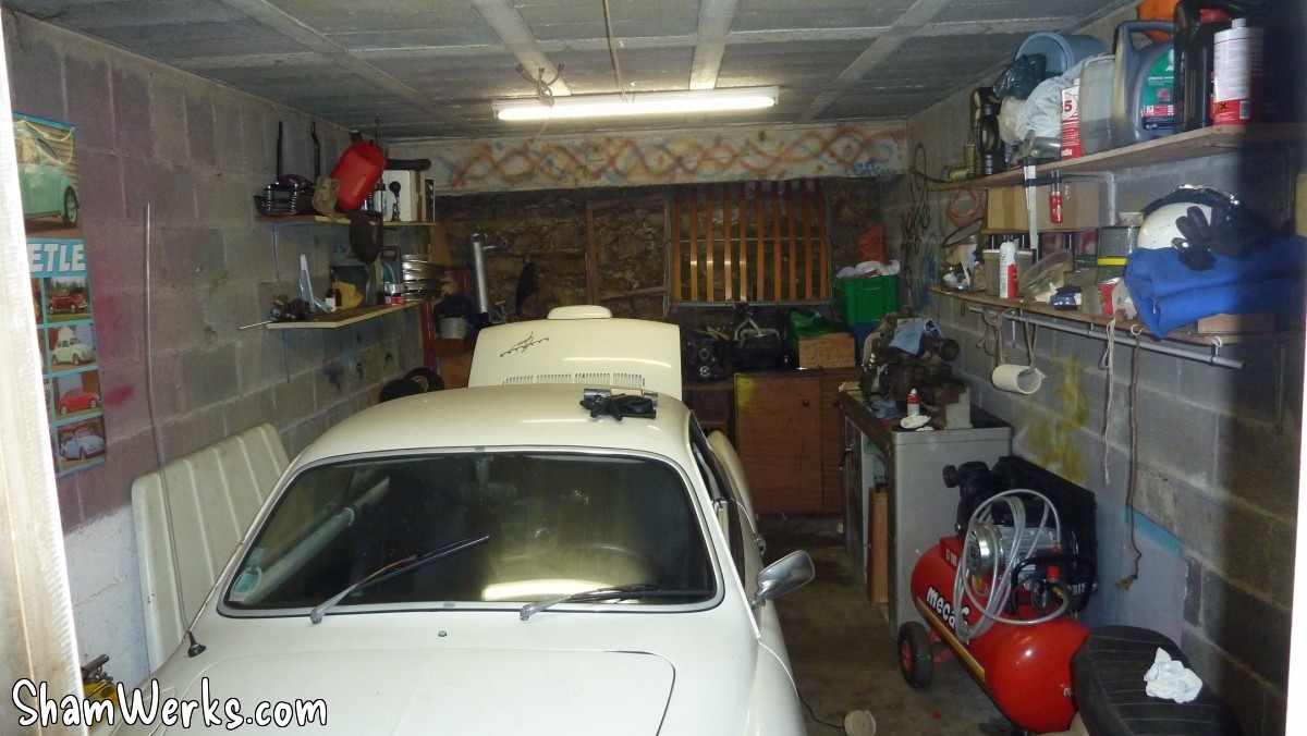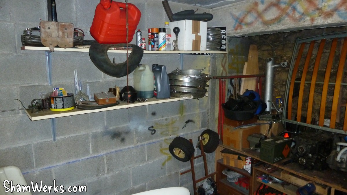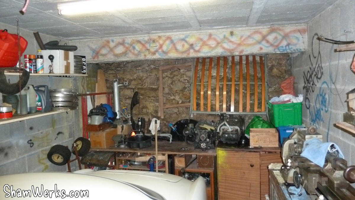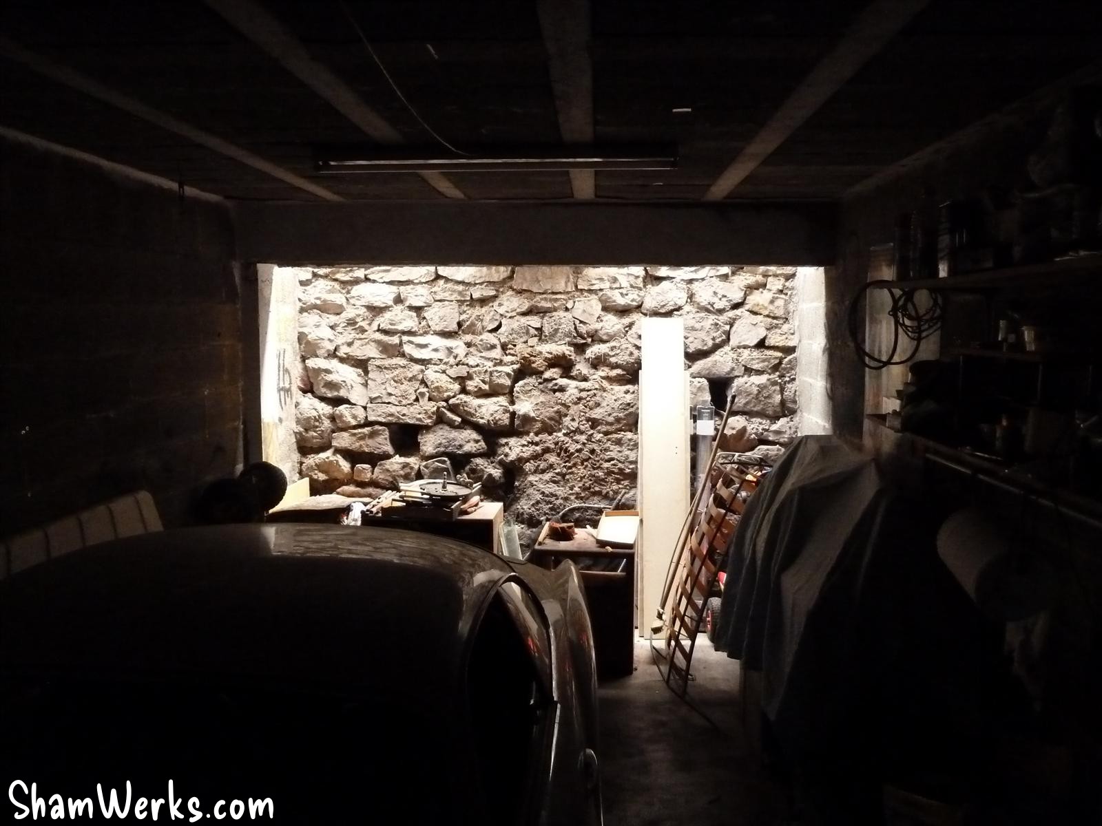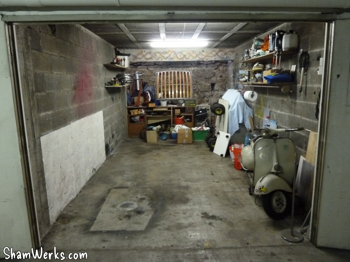Le sol en béton brut est gras à cause de l'huile et du liquide de frein renversés toutes ces années ; le béton absorbant le gras, c'est innettoyable. Le sol en béton et les murs en parpaings génèrent de la poussière en permanence, le circuit électrique fait peur, les étagères menacent de s'effondrer, l'éclairage insuffisant...