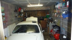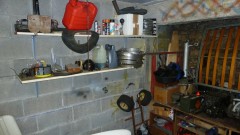 - Une longue étagère de chaque coté, quasiment sur toute la longueur du garage, 30cm de large, en multipliant les équerres pour répartir la charge. L'étagère étant à plus d'1m85 de haut, je passe dessous sans avoir à baisser la tête.