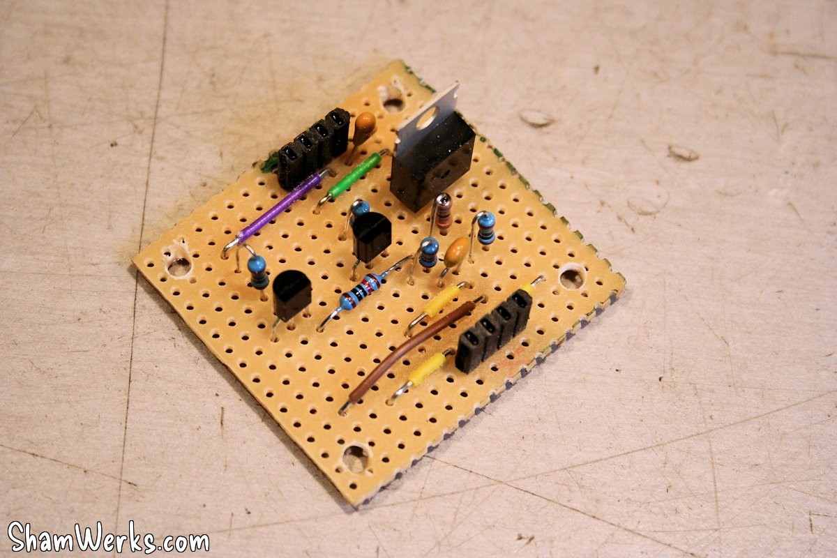 After I validated the circuit on a breadboard (it worked like a charm on the first try, I would have never guessed so!), I transfer it onto a veroboard/strip board.