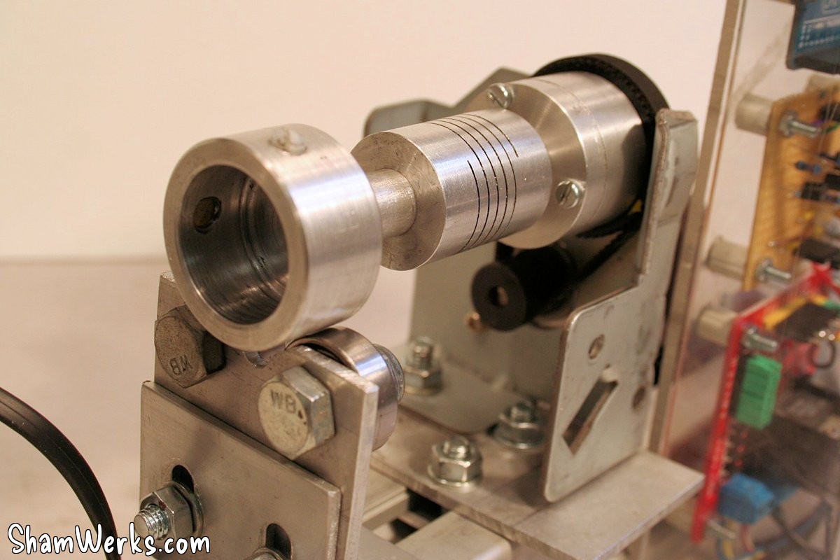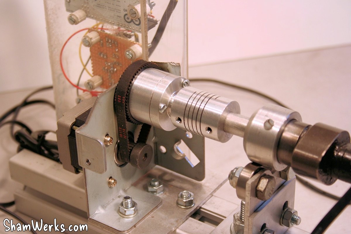 I lathe down an aluminium adapter for my stepper motor, and another one for the camshaft (with a nylon screw in order not to dent the camshaft), linked through a flexible coupler. This means I'll need a new camshaft adapter for each and every camshaft diameter... I can live with that, but I can imagine a system using a small chuck instead to avoid that.