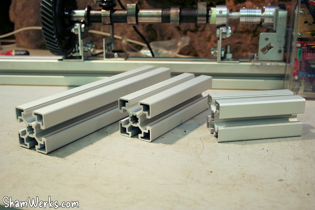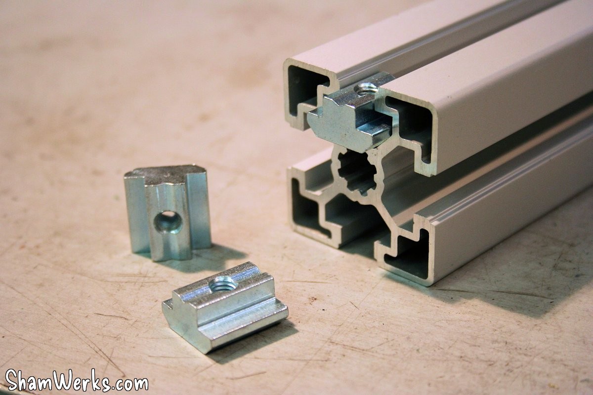 So, I order a few more pieces of the same 45x45mm Rexroth profile from Motedis : I ordered 10cm, 15cm and 25cm lengths (for an affordable 1.27€, 1.64€, and 2.38€), as I wasn't sure yet how I'd use it yet. I also ordered a few of those tapped blocks that go into the grooves ; at 0.30€ a piece, I wasn't going to go through the hassle of makin'em myself.
