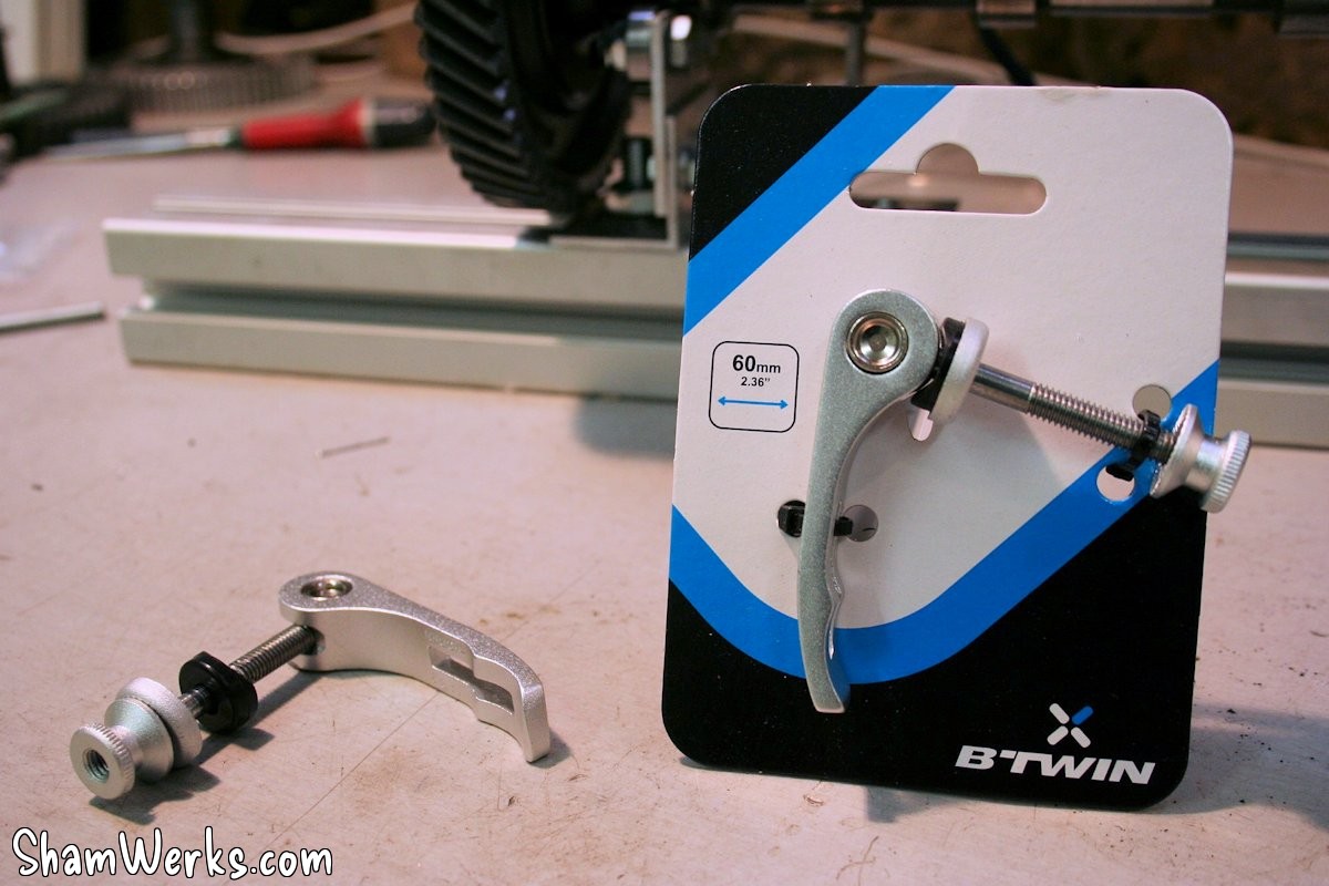 So, it works, but can be improved... As I was writing this article, a freidn o'mine gave me a good idea to make the caliper movement more user-friendly (thanks aSa!), so here's already a first evolution of the bench!The idea is to use an eccentric cam clamping lever to lock the caliper in place ; you can find these levers in bike shops, as they are use to lock saddle seats(I got mine from "Decathlon" for 5€ : see here).