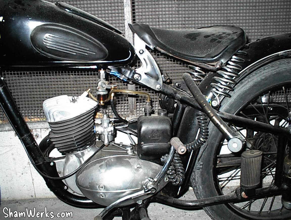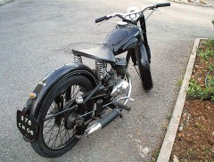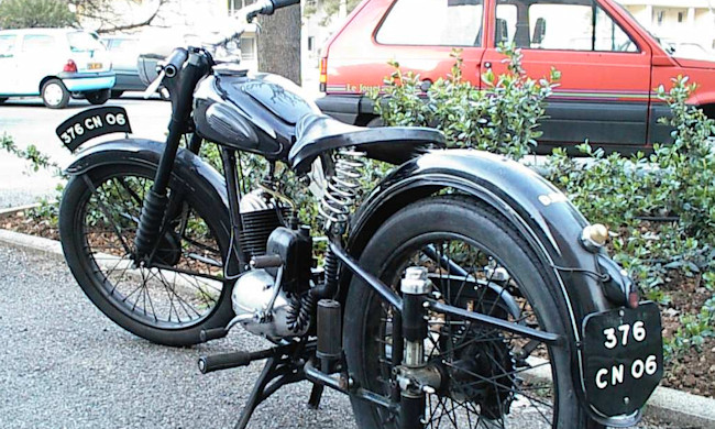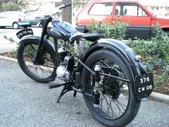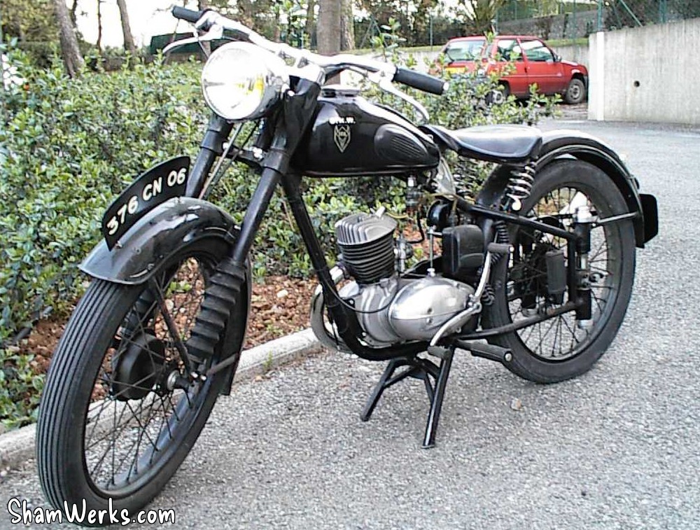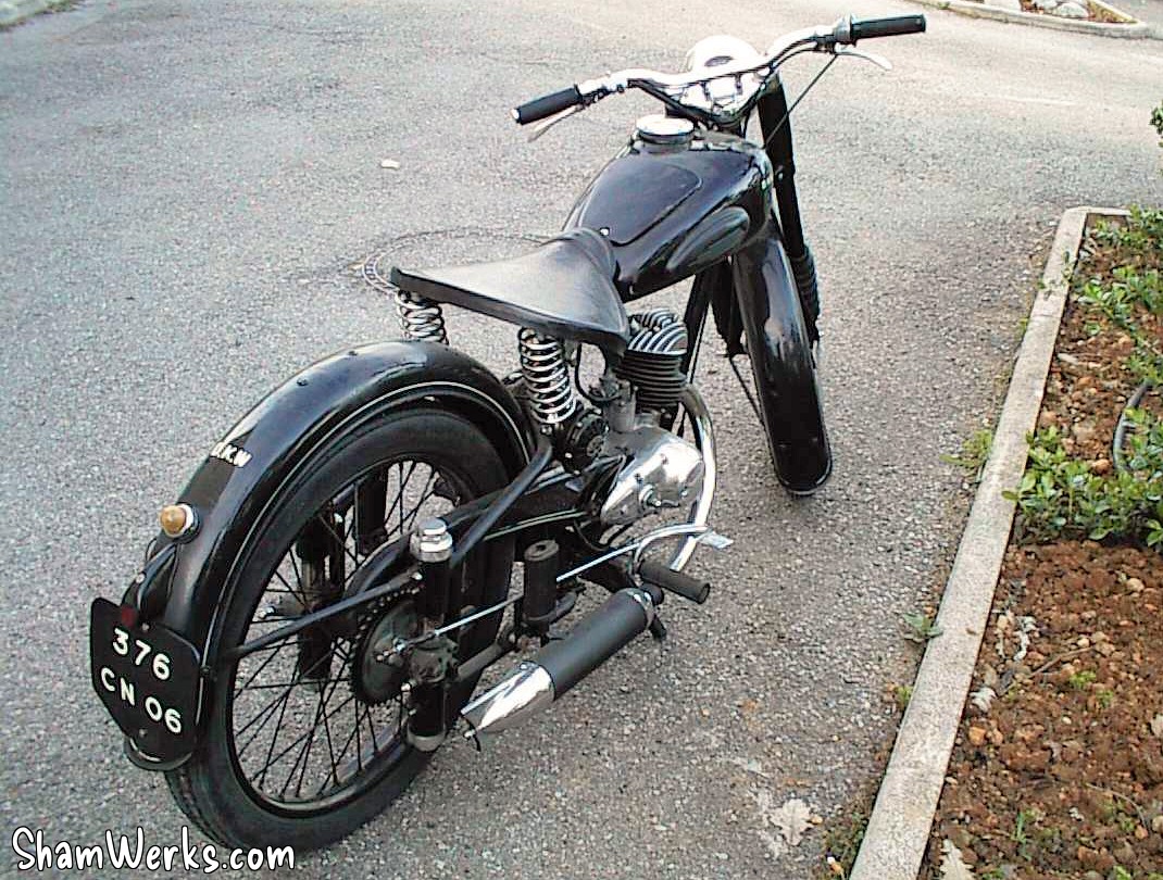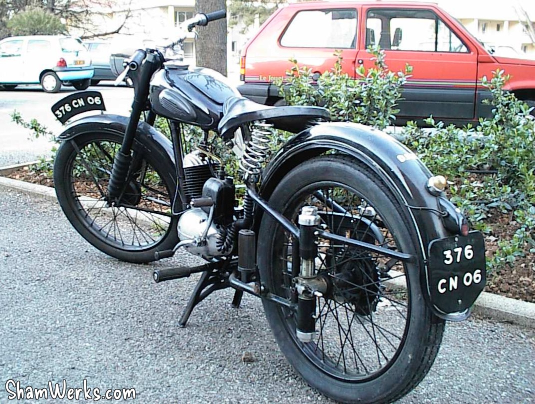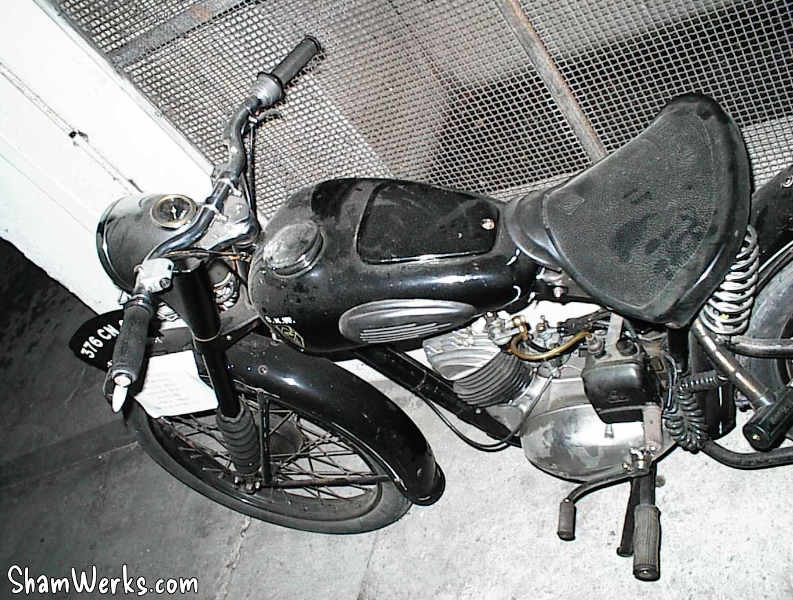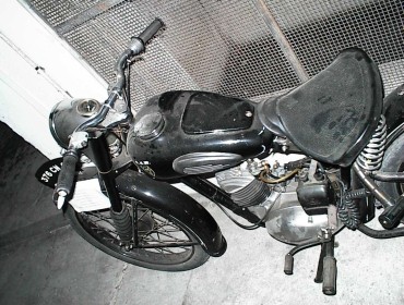 On voit sur son réservoir et son garde-boue arrière le monogramme "DKW"; visiblement, il a été rajouté à la main, au pinceau. Probablement par l'importateur francais ; en 1954, juste après la guerre, les véhicules provenant d'Allemagne de l'Est ne sont pas forcement bien vus, il valait alors mieux qu'apparaisse DKW plutôt que IFA pour d'évidentes raisons marketing! Il apparait en plus qu'elle a été vendu neuve en 54 à Nice (près de chez moi!), et donc son immatriculation est celle d'origine!
