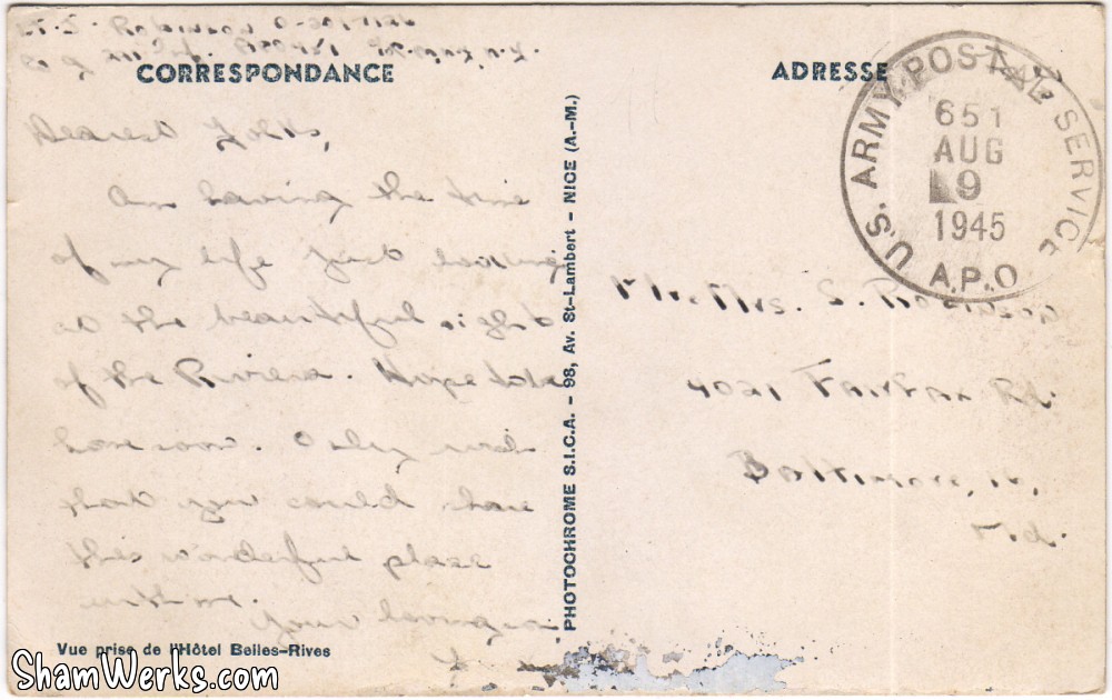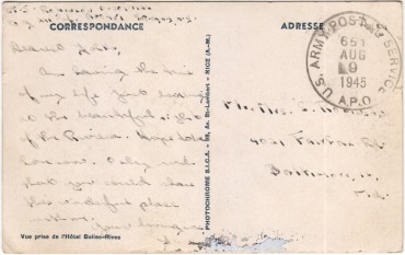 Non, c'est plutôt son verso qui est intéressant : la carte a été envoyée par le Lieutenant J. Robinson, un soldat américain alors en poste dans la région, à ses parents à Baltimore (Maryland).
