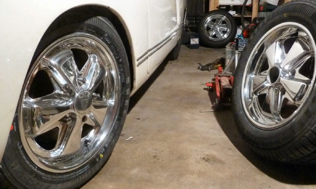 Finalement, je me suis décidé sur des Yokohama 165/65 R15 à l'avant, et du 185/65 R15 à l'arrière, commandés chez 123pneus (livré comme d'hab' en 48H, toujours une bonne adresse!). Les pneus sont montés avec des chambres, c'est pas optimal comme montage, mais bon, pas le choix avec les Deep Fuchs d'époque, elles ont pas les talons pour monter des tubeless...