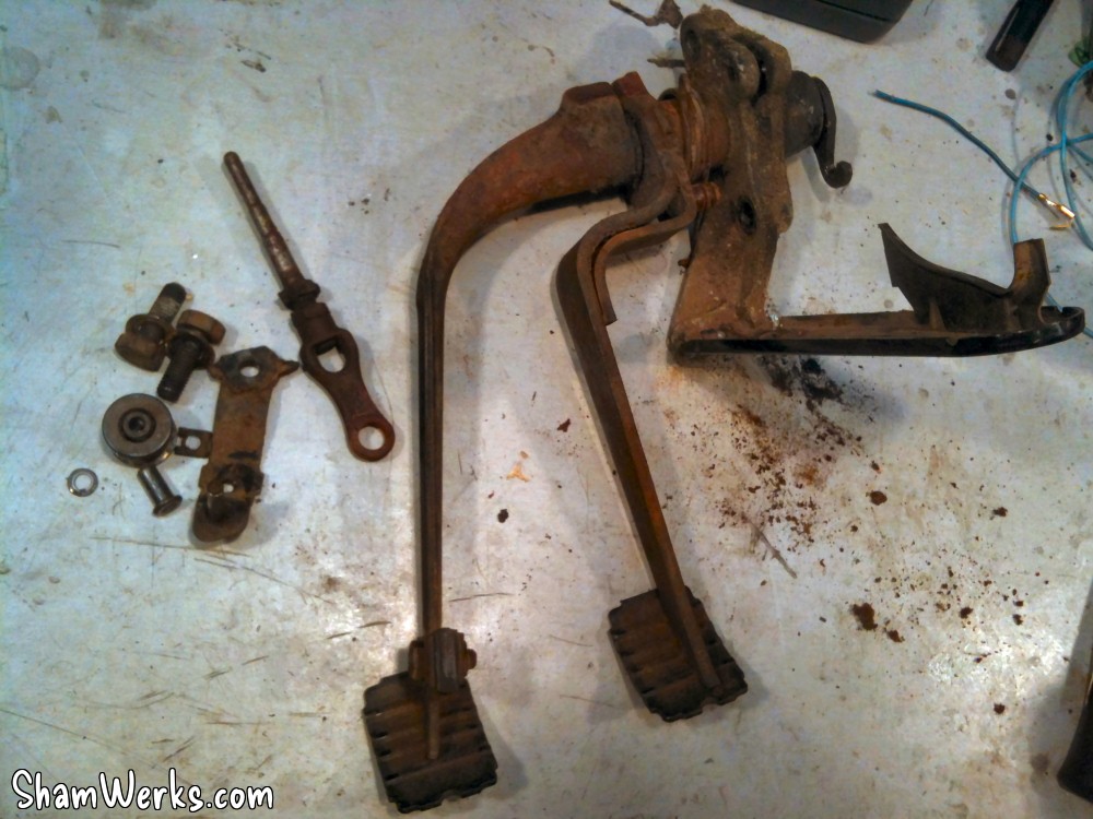 Pour changer ce câble, il faut sortir le pédalier, mais quand j'ai vu sa tête, j'ai préféré lui redonner un coup de jeune avant le remontage! En avant, désassemblage / nettoyage / sablage / peinture, microbillage de la quincaillerie, remontage avec des pièces neuves...